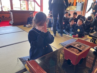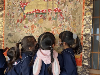 今日は涅槃会集会がありました。 お釈迦様が亡くなった日はどんな日だったのか、理事長先生の話を聞き、その後お焼香をしました。お焼香の煙が広がっていくのは、お釈迦様の教えが広がっていくように、においがお洋服につくのは、教えが染み付くように。とのことを教えて頂きました。涅槃図には、けものや小鳥や鬼、虫たちが皆泣いていたり、月は黒かったりとじっくり見て気づいていました。
