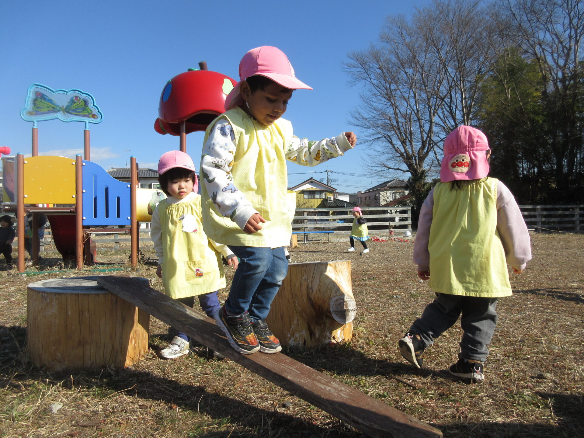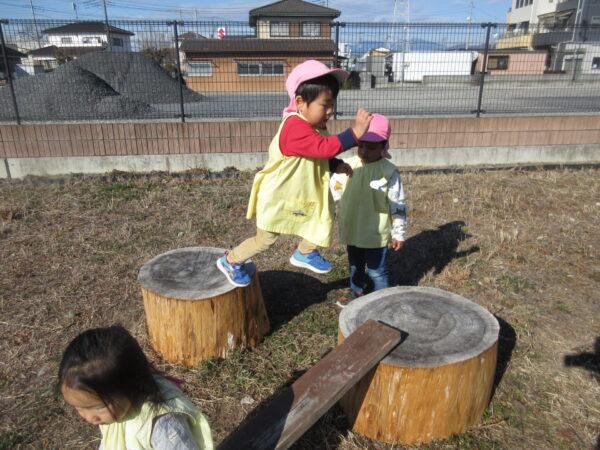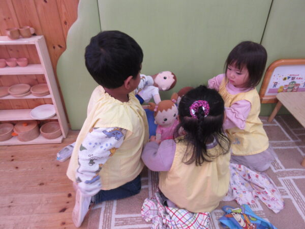 おままごと遊びで、お料理したり、赤ちゃんのお世話をしたりと、お母さんやおねえさんになりきっていました。優しくトントンしたり、ご飯を食べさせたりしながら会話を楽しんでいました。また、今日は穏やかな陽気でしたので、はらっぱで思い切り体を動かして遊びました。自分の体で、様々な感覚を体験しています。