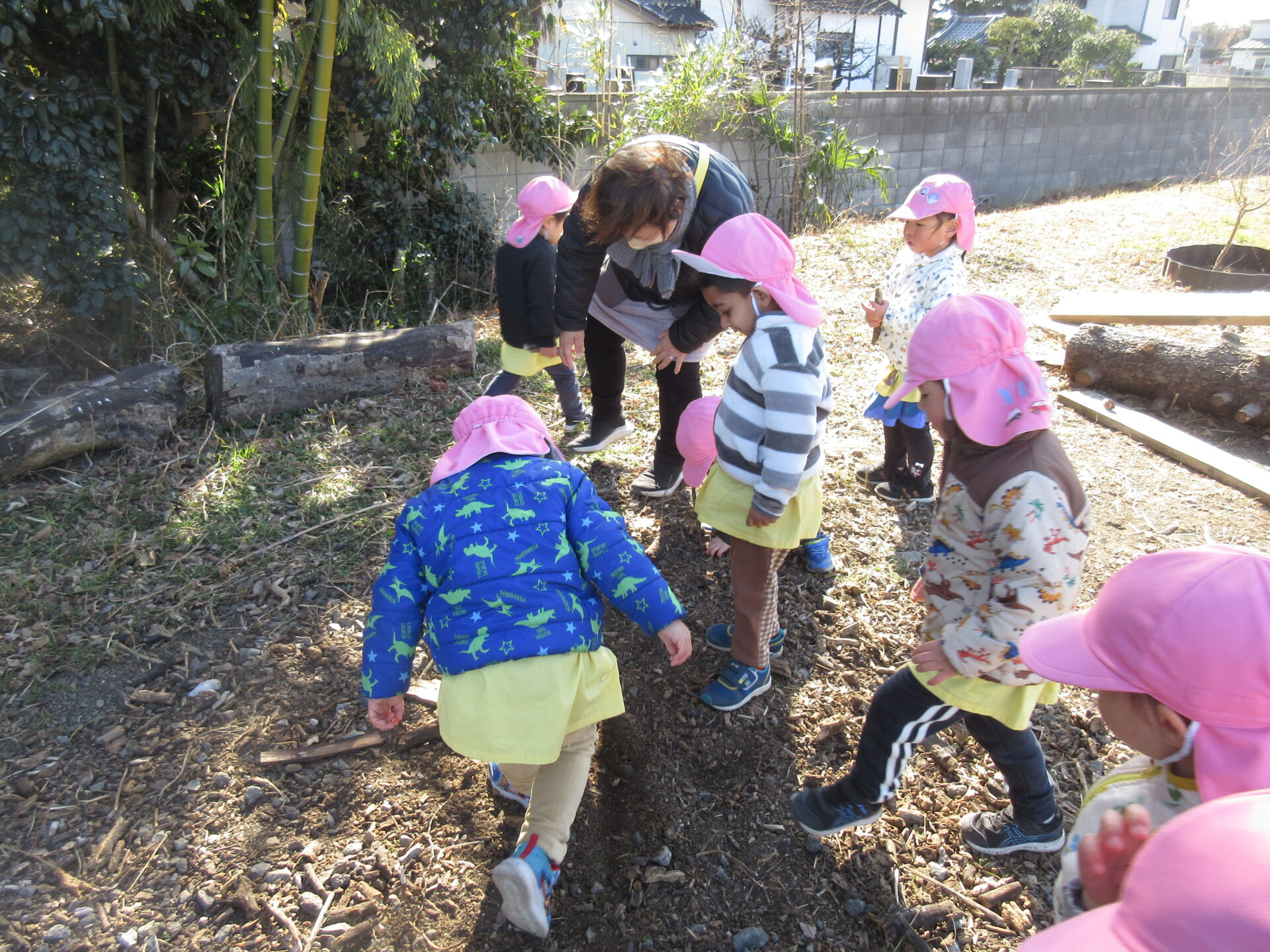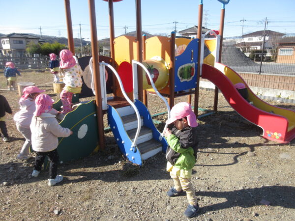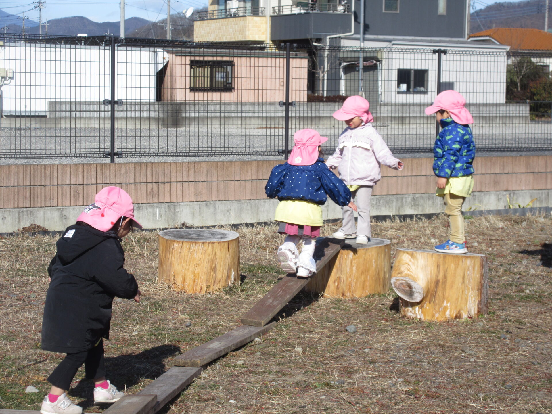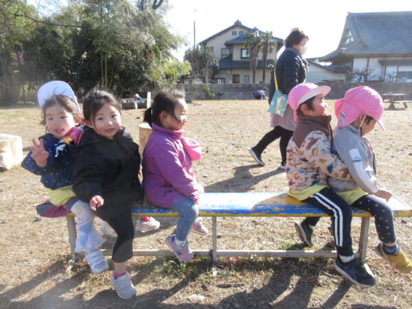 今日も子育てガーデン広場で遊んできました。風がとても強かったですが、それも楽しい遊びになっていました。昨日に引き続き木屑のところでカタツムリの殻探しやベンチを使ったバスごっこを楽しんでいました。丸太渡りも積極的にチャレンジしていて、一人で渡り切れると、おともだちと喜び合う姿も見られました。