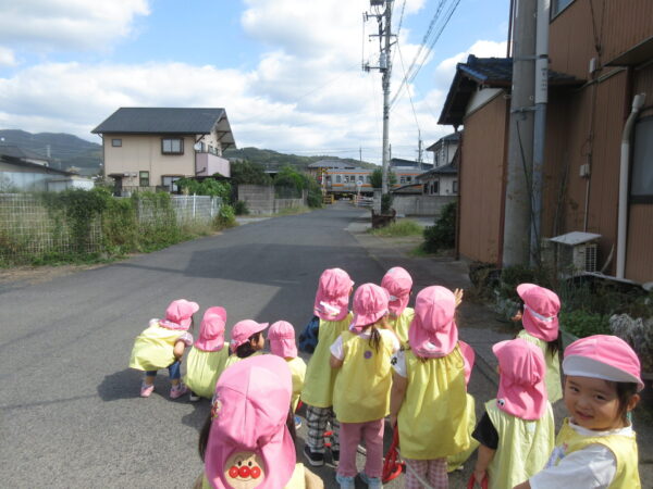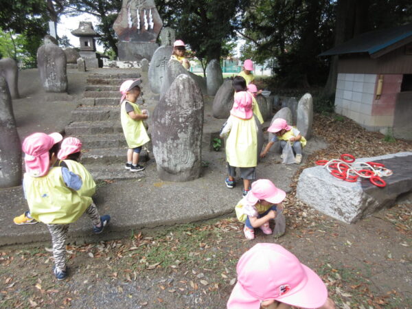 クラスのおともだちが「どんぐりや松ぼっくり」「栃の実」を持ってきてくれて庭遊びなどで楽しんでいた中で、自分たちも「どんぐり拾いがしたい!」と言うことで、今日は篠生神社に行ってきました。神社横には緑色の若いどんぐりがたくさん落ちていました。「あっ!ぼうしかぶってる。」「こっちにいっぱいあるよ」など声を掛け合ってどんぐり拾いを楽しむことが出来ました。