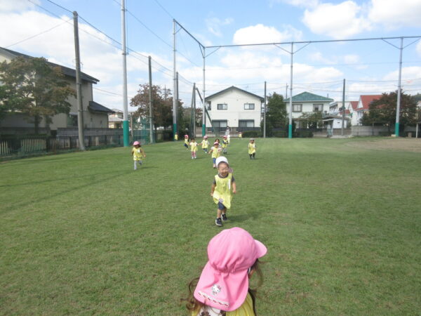 走ることが大好きな子どもたちは、ひろーい芝のグラウンドでたくさんかけっこもしました♪ トンボを見つけると、自分たちもトンボになって飛んでいました♪
