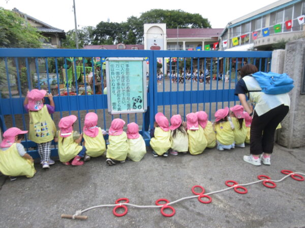 散歩に行く前に、ふじ組さんの和太鼓を門から見学しました。お兄さんやお姉さんたちがカッコよく和太鼓を叩く姿に食い入るように見ていました。演奏が終わると自然と子どもたちも拍手していました。「かっこよかったね」と話している子もいました。「みんなももも組やふじ組さんになったら、太鼓やるんだよ!」と話すと、「えー!」という子もいれば、「やったー!」と喜ぶ子もいて、反応が楽しかったです♪