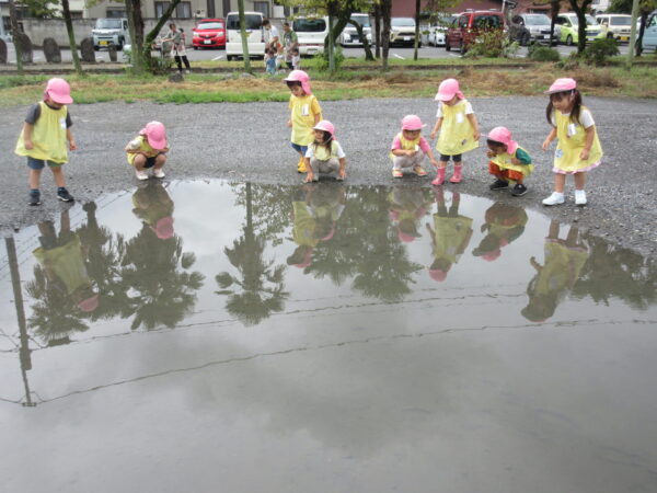 今日は過ごしやすい日になったので、お散歩に行ってきました。空き地に大小の水溜りがあり、好きな水溜りを覗き、水面に映る自分や友だちに手を振ったり、空や太陽が映っていることにも気づいてみんなに知らせる様子が見られました♪ また、プーさんのおうちの庭でたくさん走ってきました!