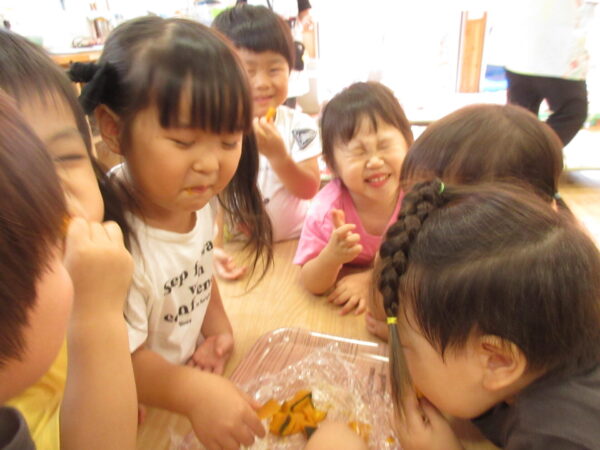 幼稚園の畑で収穫したカボチャを湯本かずみ先生が茹でてお裾分けしてくれました。みんな「食べたーい!」とかぼちゃの周りに集まり食べてみました。優しい甘さでホクホクなかぼちゃにみんなの手が止まらず、あっという間に完食していました。いつもは野菜を食べない子も食べてくれました♪