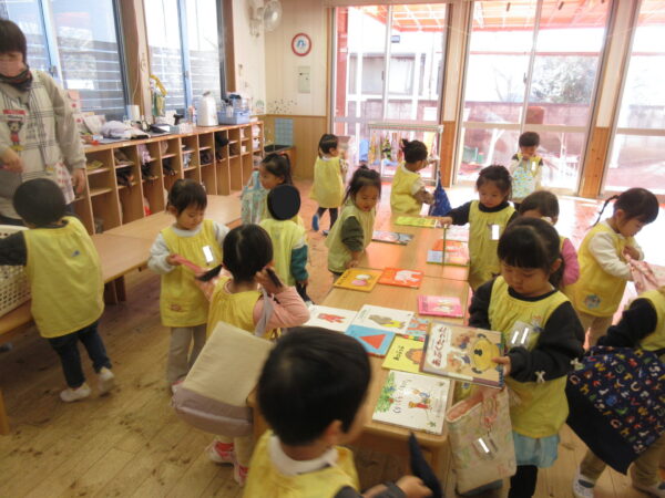絵本借りを行いました。「なんの本にしようかな?」と絵本をじっくり選ぶ子もいれば、「この本にする!」と迷いなく選ぶ子もいました。お家で見るのが楽しみなこどもたちでした☆