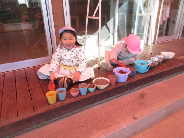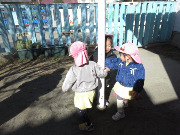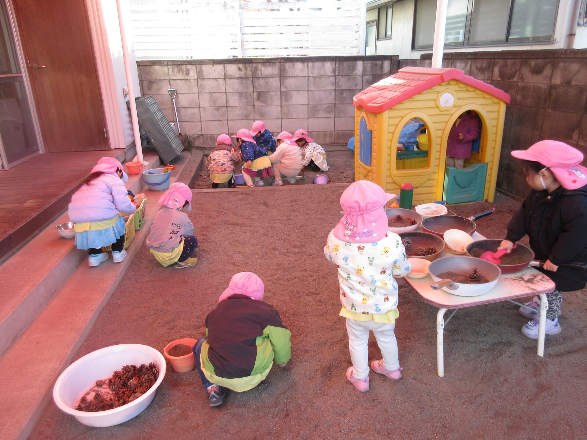 センター庭で遊びました。庭のあちこちでおままごとを楽しんでいました。出来上がったお料理には、松ぼっくりやどんぐを上手に使って飾り付けがされていました。柱を片うでに絡ませ軸にして、ぐるぐるまわりながら追いかけっこをしていました。まわった後うでを離すと、みんな目が回ったようで、ふらふらしていましたが、それも面白かったようで何度も遊んでいました♪