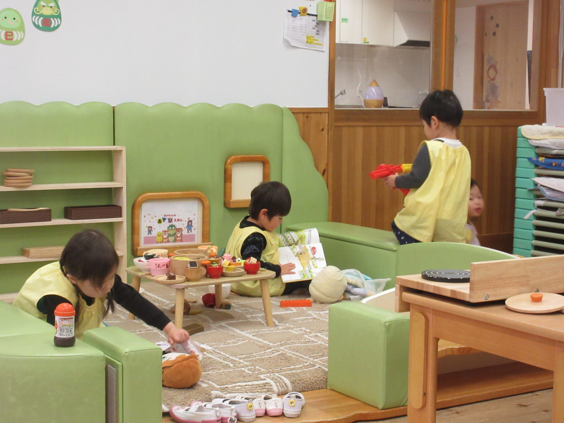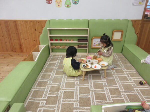 寒さもあったので、室内コーナー遊びをしました。ままごとコーナーでは、テーブルいっぱいに美味しいものを並べてパーティーが始まったり、お人形を赤ちゃんに見立ててお母さんごっこや、じっくり絵本を楽しむ子もいました。
