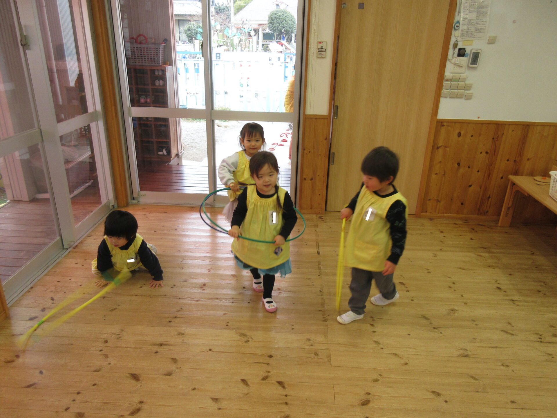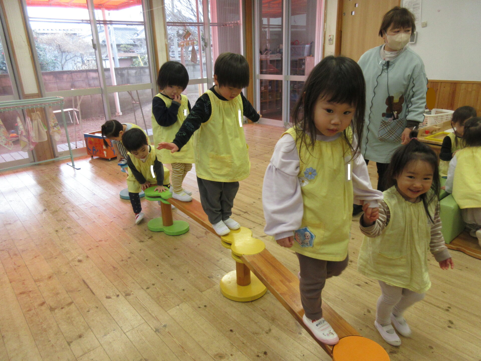 フラフープや平均台も用意してみると、輪っかに入って電車ごっこを楽しんだり、平均台でも台をまたいでバスに見立てたりしていました。また、平均台では、お友だちの手を持って、助け合って渡る姿も見られました。