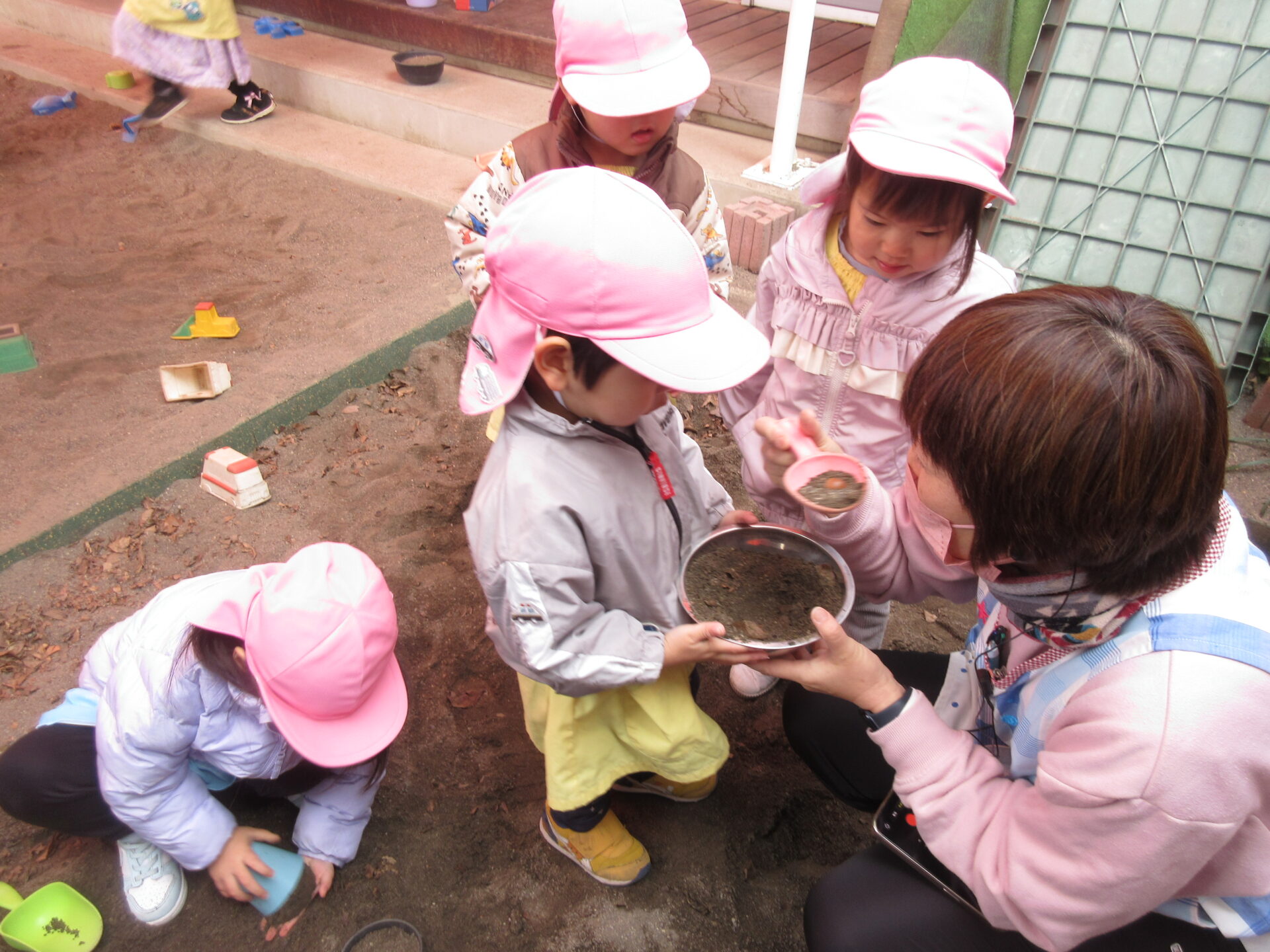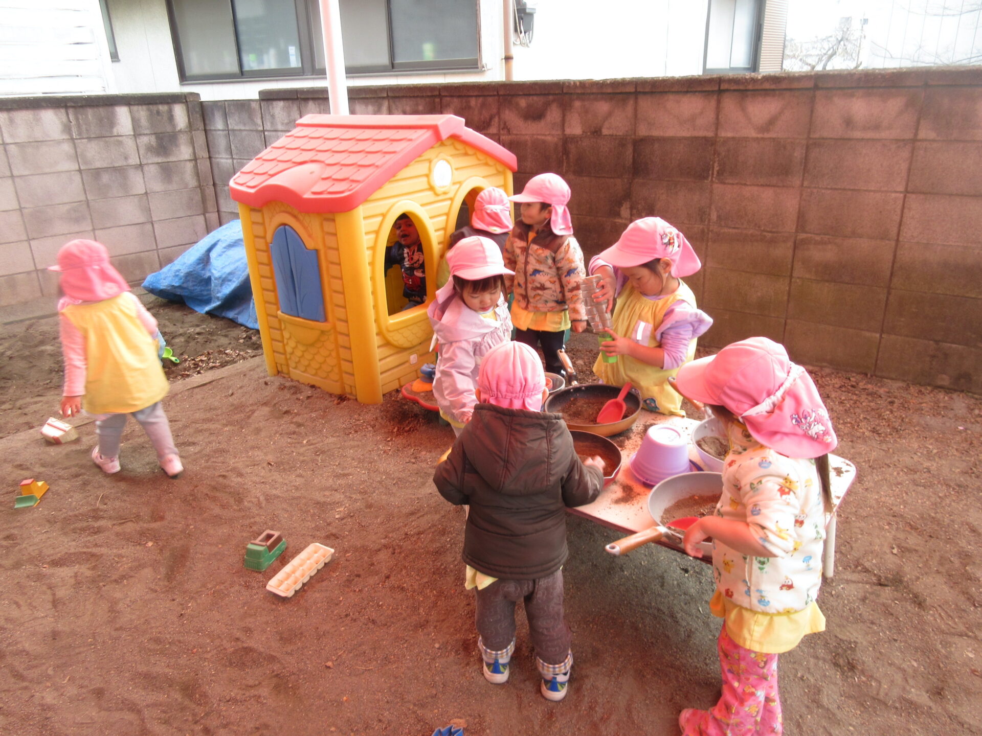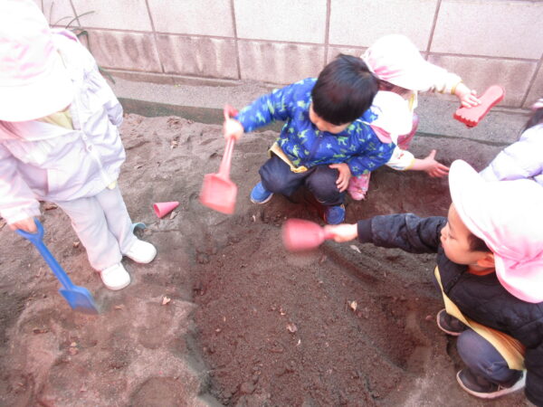 3学期が始まり、クラス内も元気な声が響き渡りました。今日からまた、こどもたちとたくさん遊んで過ごしていきます♪ センター庭で遊びました。砂場では先生やお友だちと一緒に力を合わせて山づくりを楽しみました。小さいシャベルより大きなシャベルの方が砂をたくさん掘れることがわかり、「大きくなーれ!」と言いながら作った山を最後はみんなで踏むと小さくなって大笑いしていました♪ また、かき氷やアイスなど砂で見立てて作って楽しむ様子もたくさん見られました♪
