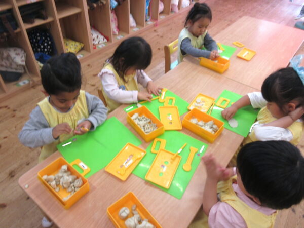 室内でコーナー遊びをしました。粘土やままごと・平均台など好きな遊びを選び、ともだち同士や先生と楽しくすごせていました。「〇〇をつくりたい!」など、明確なものが子どもたちの中に出てきて、作るもの対して自分で考えたり、先生と一緒に考えながら作ることを楽しめるようになってきました。出来上がると嬉しそうにお友だちと見せっこしたり、作ったものを使って遊んでいました♪
