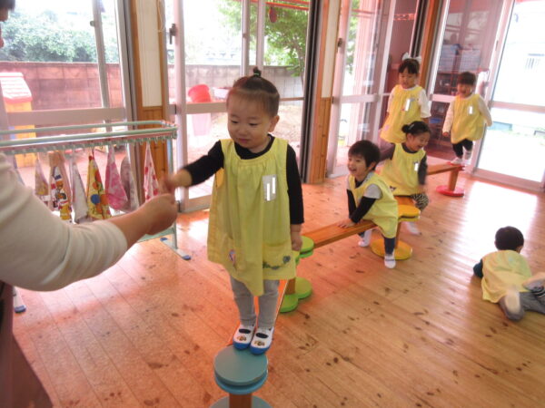 平均台では、立って渡ることが上手になりました。まだ立って渡ることが怖い子もいて、おともだちが手を繋いで助けてくれたり、座って渡るなど工夫して楽しむ様子も見られました☆