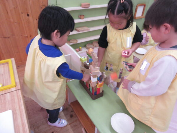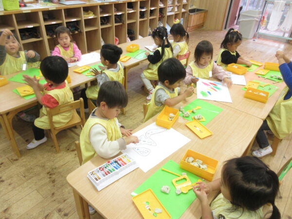 今日は室内コーナー遊びをしました。粘土やお絵描きコーナーは大人気で、思い思い好きなものを作ったり、好きな色を使ってお絵描きを楽しんでいました。描いたものに意味づけしたり、これを描きたい!粘土でつくりたい!と目的を持って遊べるようになりました♪ ままごとの食べ物を積み木に置くなど、おしゃれな感じに飾って楽しむ様子も見られました。「なんか、すごいケーキみたいだね♪」と食べ物をどうやって飾るかおともだちとお話しながら楽しんでいました☆