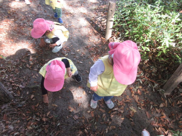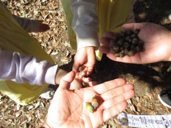 秋晴れの中、篠生グラウンドまで散歩に行ってきました。広ーい芝の上を「位置について、よーい、どん!」とミニミニスポフェスのかけっこと同じ声かけで元気いっぱい走ってきました♪ その後、神社裏の林へいき、どんぐり拾いも楽しんできました。以前はほとんどのどんぐりが緑色でしたが、今回は茶色に変化していました!ポケットいっぱいに拾ったどんぐりはお土産に持ち帰りました