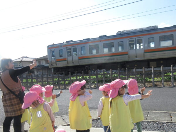 園へ戻る途中、電車の通過をみることができました。以前は手を振ると汽笛を鳴らしてくれたのですが、今回は汽笛が聞こえず、みんなでズコ〜っと大笑いでした。次回は汽笛を鳴らしてくれるかな?と期待していた子どもたちでした☆