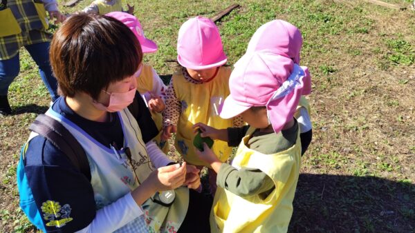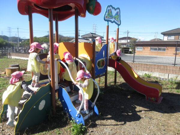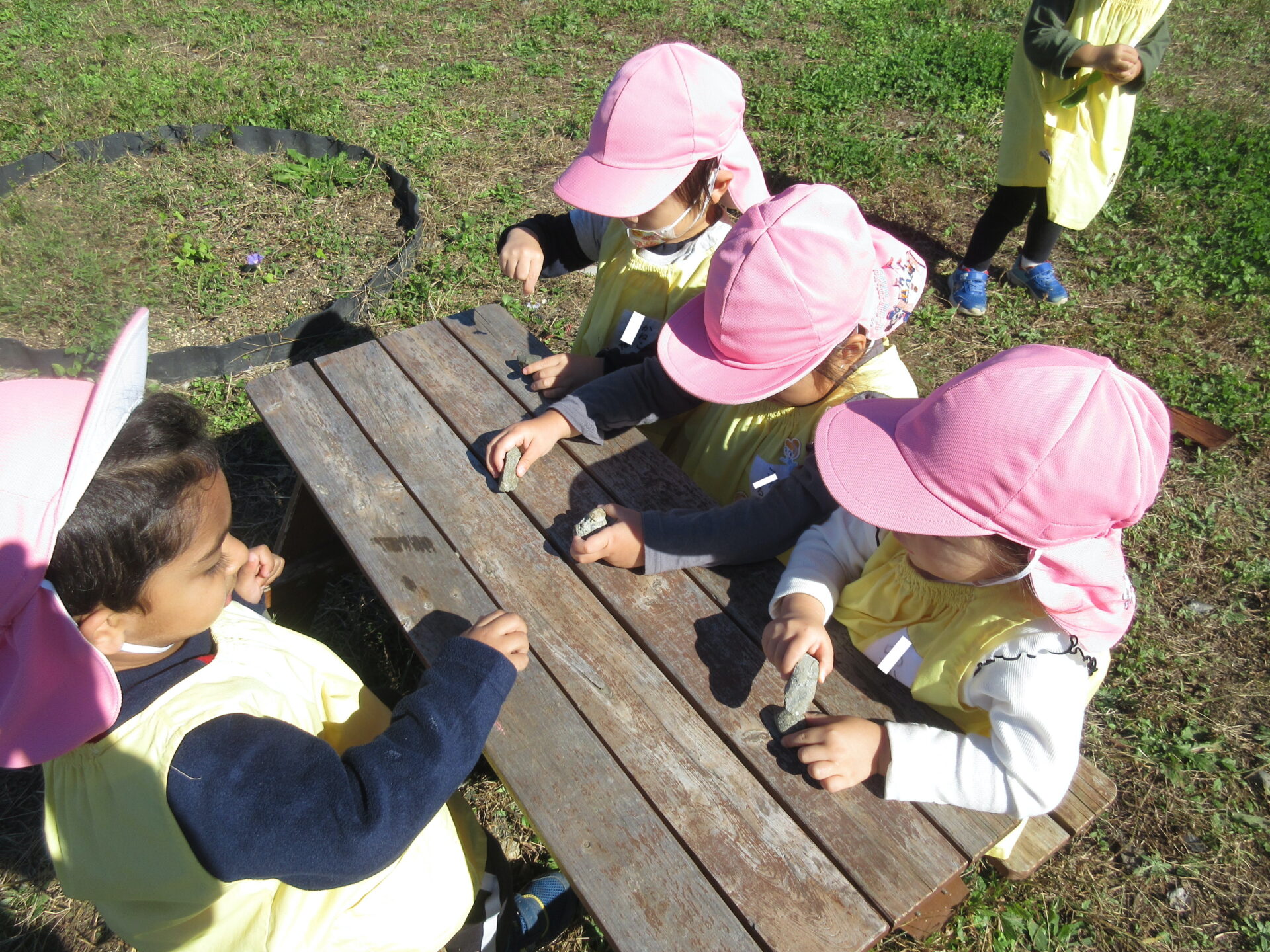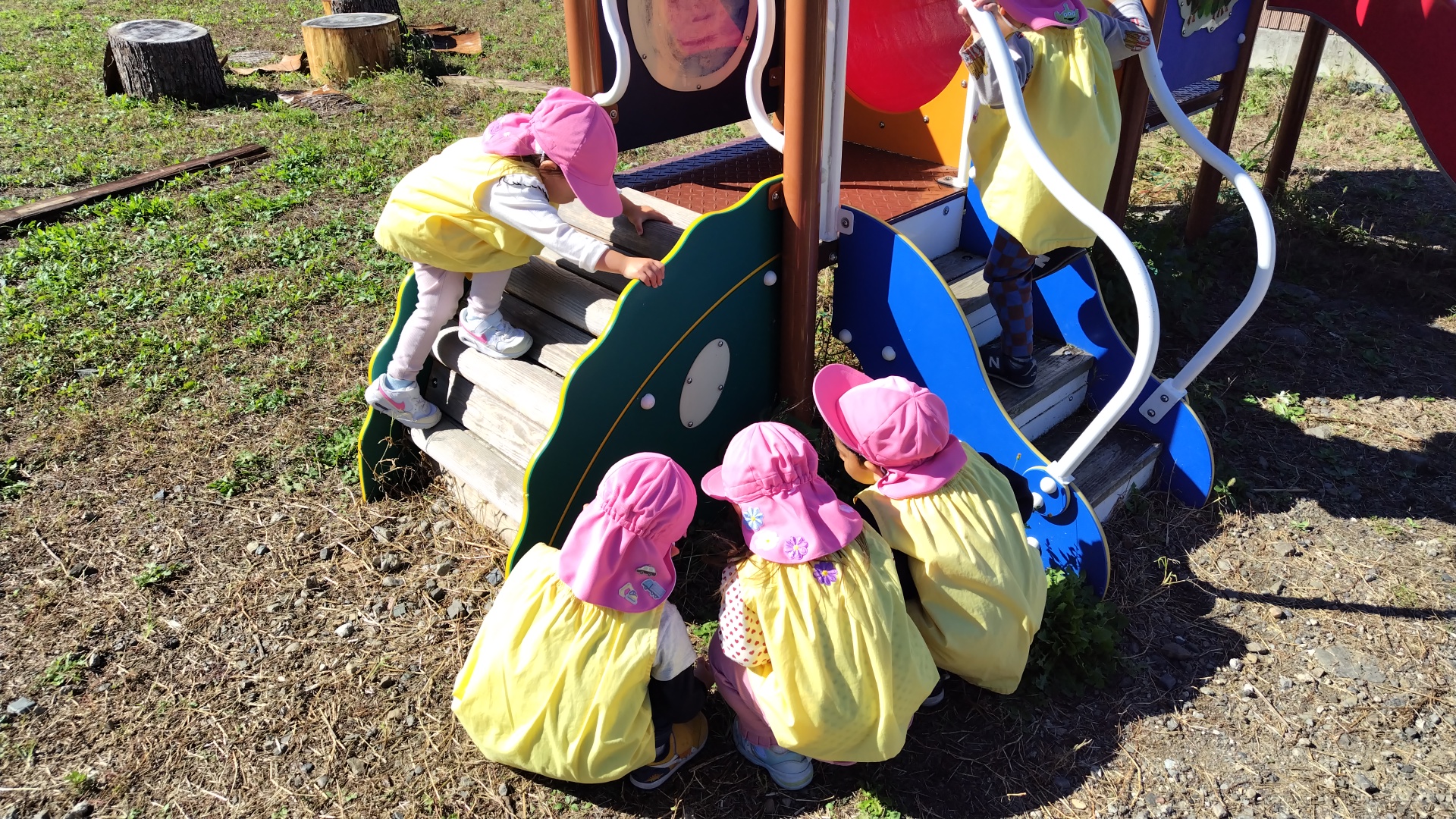 251028104143626LS 251028104232873LS 子育てガーデン広場で過ごしました。今日は風が強めでしたが、その強い風を全身で感じながら楽しんでいました♪ 滑り台に小さな虫を発見すると、すぐに「なになに?」と友だちが集まってきて観察会が始まりました。動きが面白かったようでじっくり観察していました。また、石を使って遊んだり、先生に葉っぱを使った遊びも教えてもらって挑戦する様子も見られました。先生が葉っぱを叩くと「パン!」といい音がすることに驚いていました☆