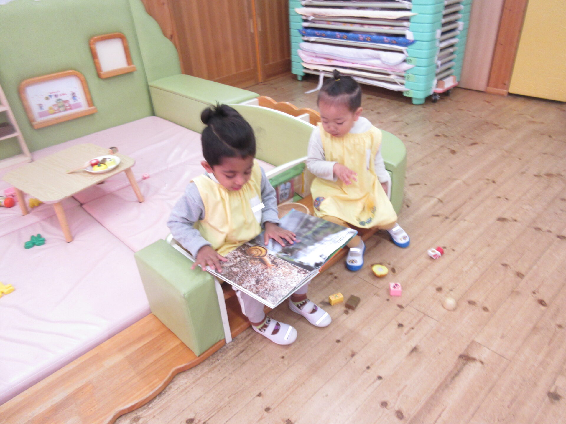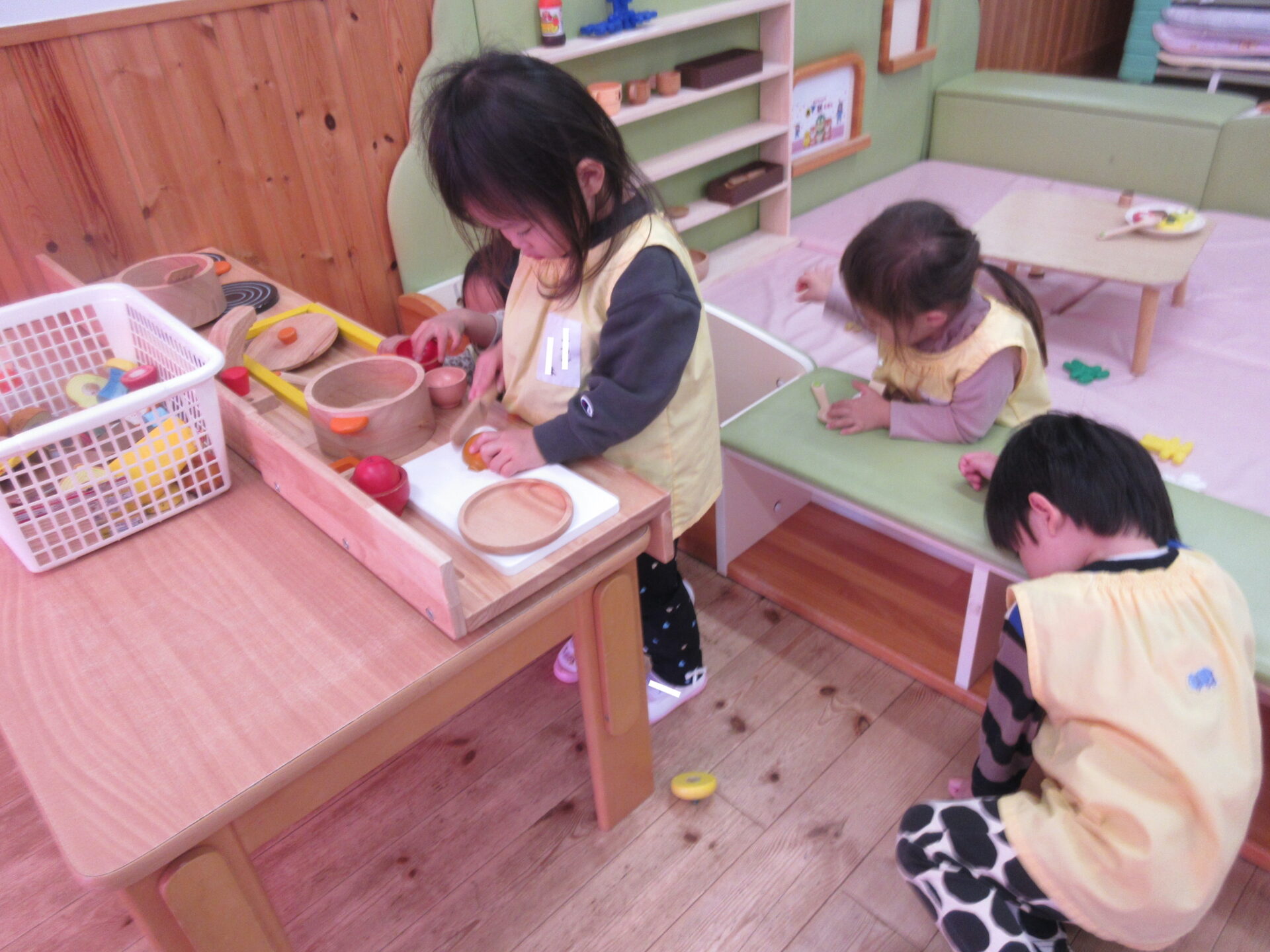 ままごと遊びを楽しんでいる子どもたち。お野菜を心地よいリズムで「トントントン」ときざんだり(きざんだつもり)、お鍋で炒めたり、作ったものをテーブルに並べるなど、お家での一コマが、おままごとの中で繰り広げられていて、とても楽しいです♪ お母さんやシェフになりきっている子どもたちも素敵です☆ 絵本も大好きで、一人で見たり、ともだちと見たり、思い思い好きなスタイルで絵本を楽しんでいます♪