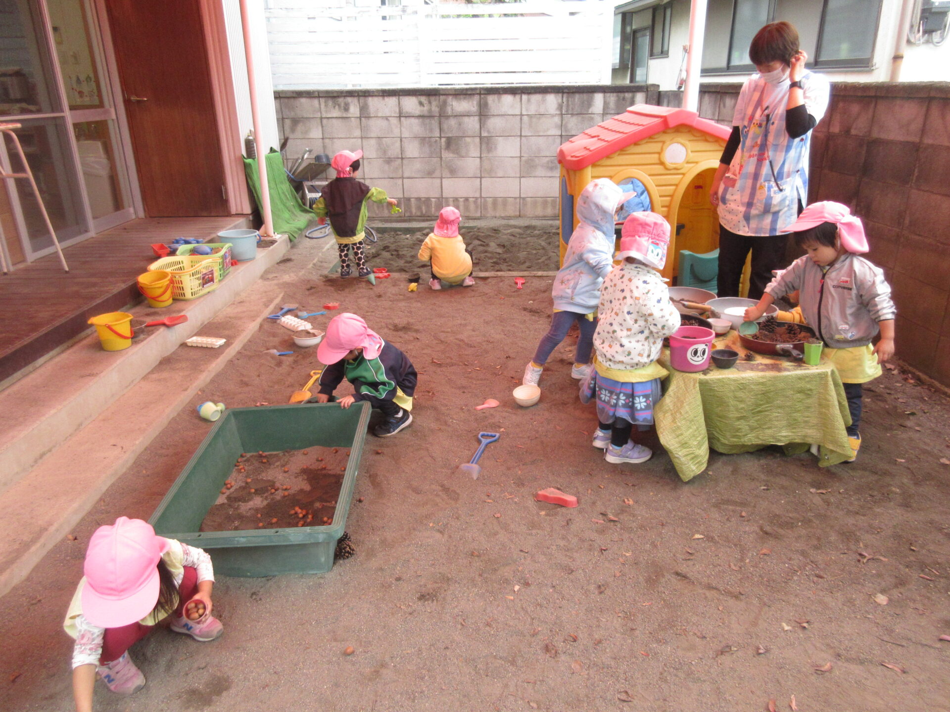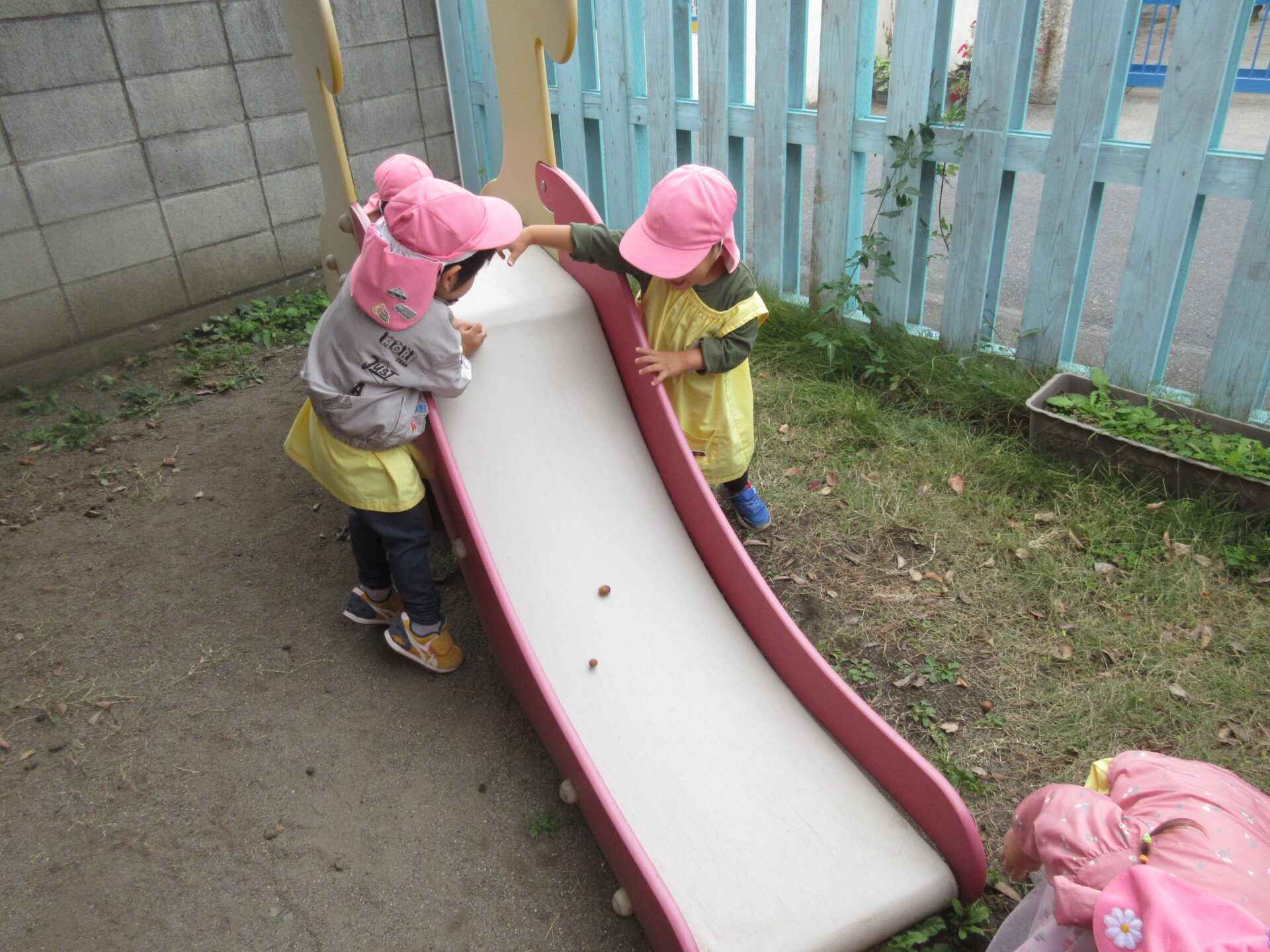 今日はセンター庭で遊びました。少し寒さもあったのですが、「外で遊びたい!」と元気いっぱいでした。どんぐりや松ぼっくりを使っておままごとや、滑り台を使ってのどんぐり転がし競走など、おともだちと会話を弾ませながら遊びを見つけて楽しんでいました♪