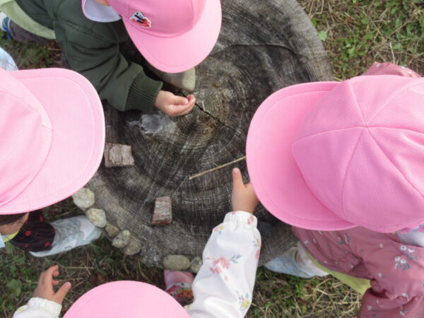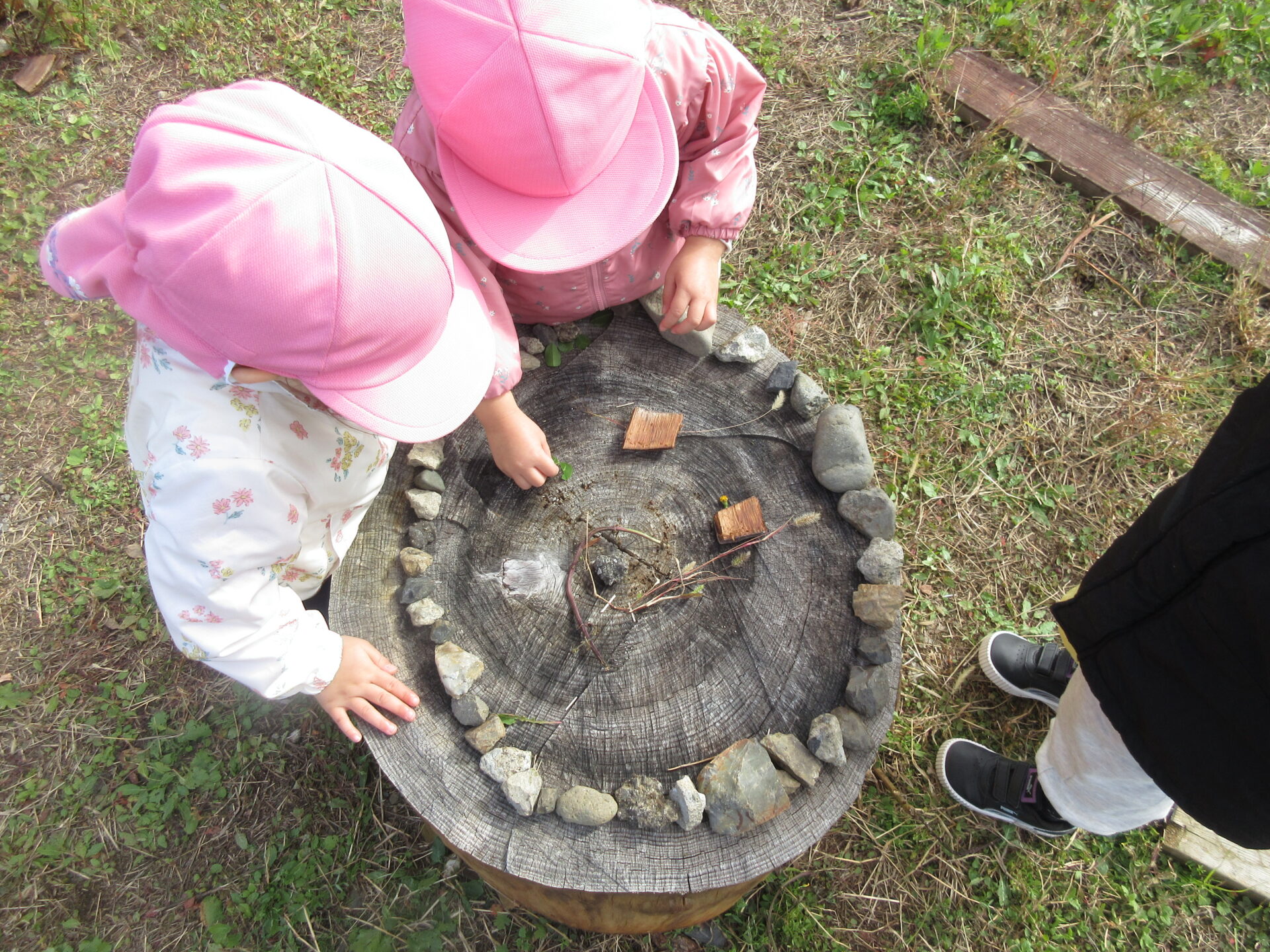 切り株をケーキに見立てて、石や枝、草花を使って飾り付けをしていました。先生が見守る中、「これ(木の皮)はいちごね」「こっち(石)はクリームだからまわりに並べようよ」などみんなで工夫しながら飾り付けを楽しんでいました。とっても上手にできた出来上がったケーキを囲んで、お誕生会が行われていました♪