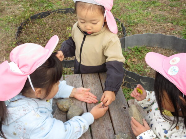 子育てガーデン広場で遊んできました。先週に引き続き、切り株に登ってカウントダウンしてからのジャンプや、テーブルに大小の石や草花を使ってのままごとをおともだちと楽しむ姿が見られました。