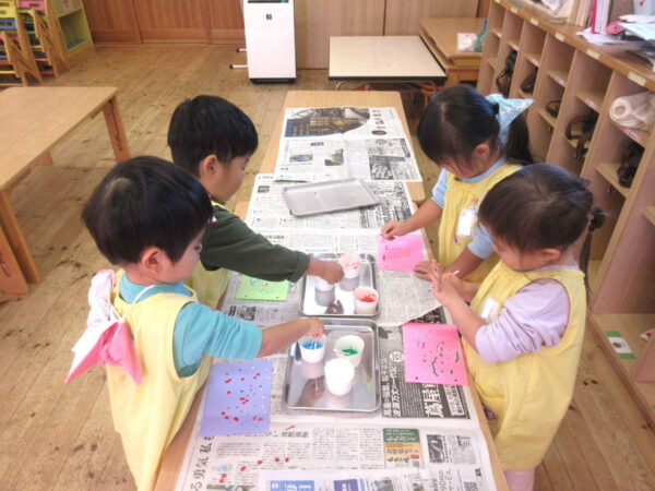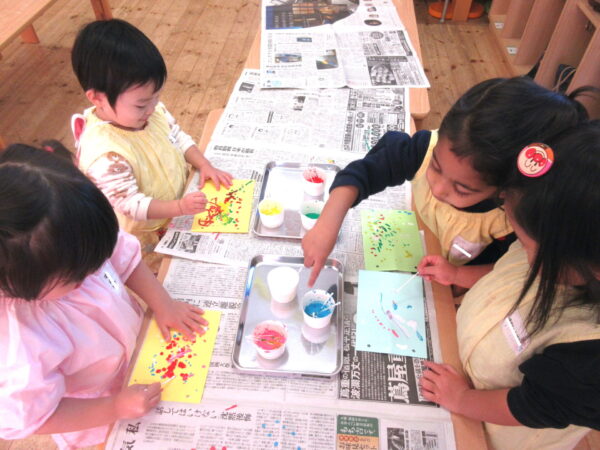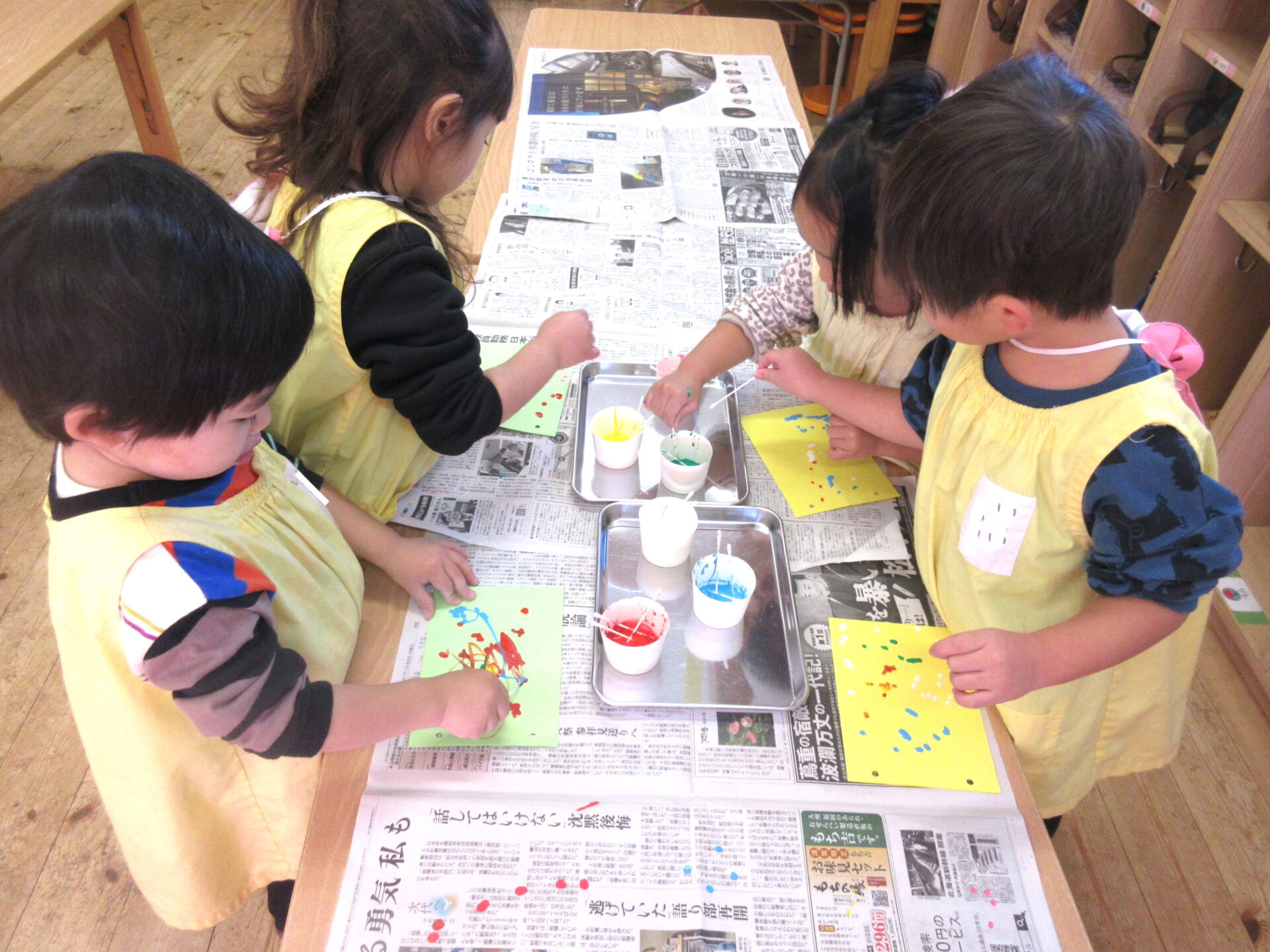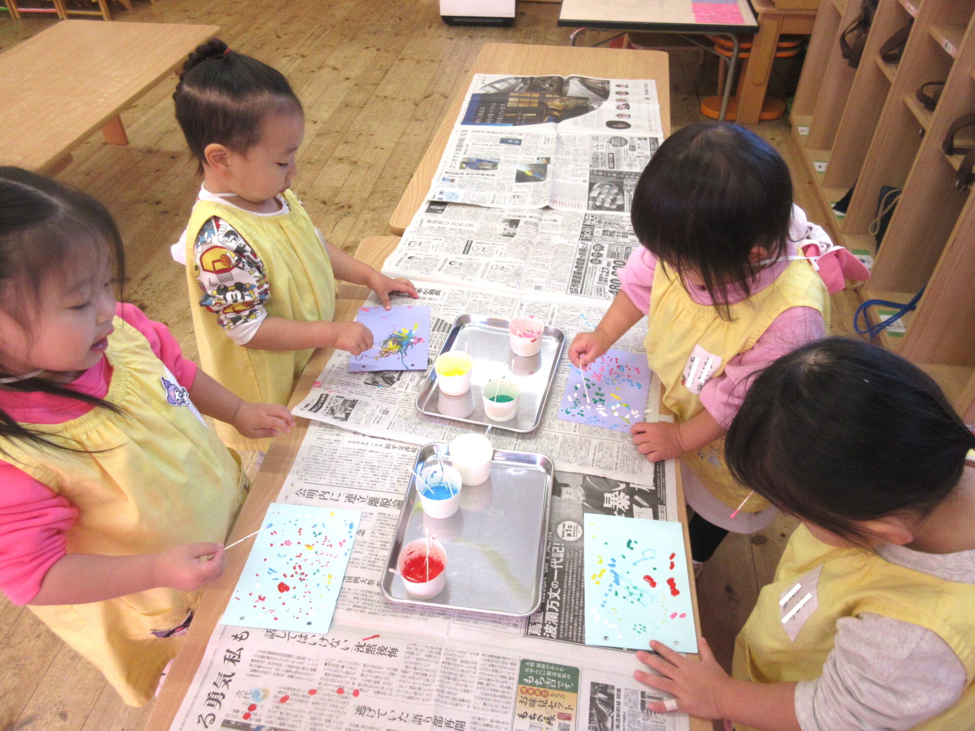 今日はコーナー遊びの一つとして「絵の具遊び」をしました。綿棒を使って色を画用紙につけていくのですが、ポンポンとスタンプのようにしたり、線や丸やハート、なかには顔を描く子もいて、好きな色を選びながら絵の具遊びを楽しんでいました。 庭遊びでは、どんぐりや落ち葉を使ったままごと遊びや、松ぼっくりを滑り台で滑らせて、どこまで転がるかゲームをともだち同士で遊んでいました。落ち葉を踏んだ時のザクザクした感触も面白いようです♪