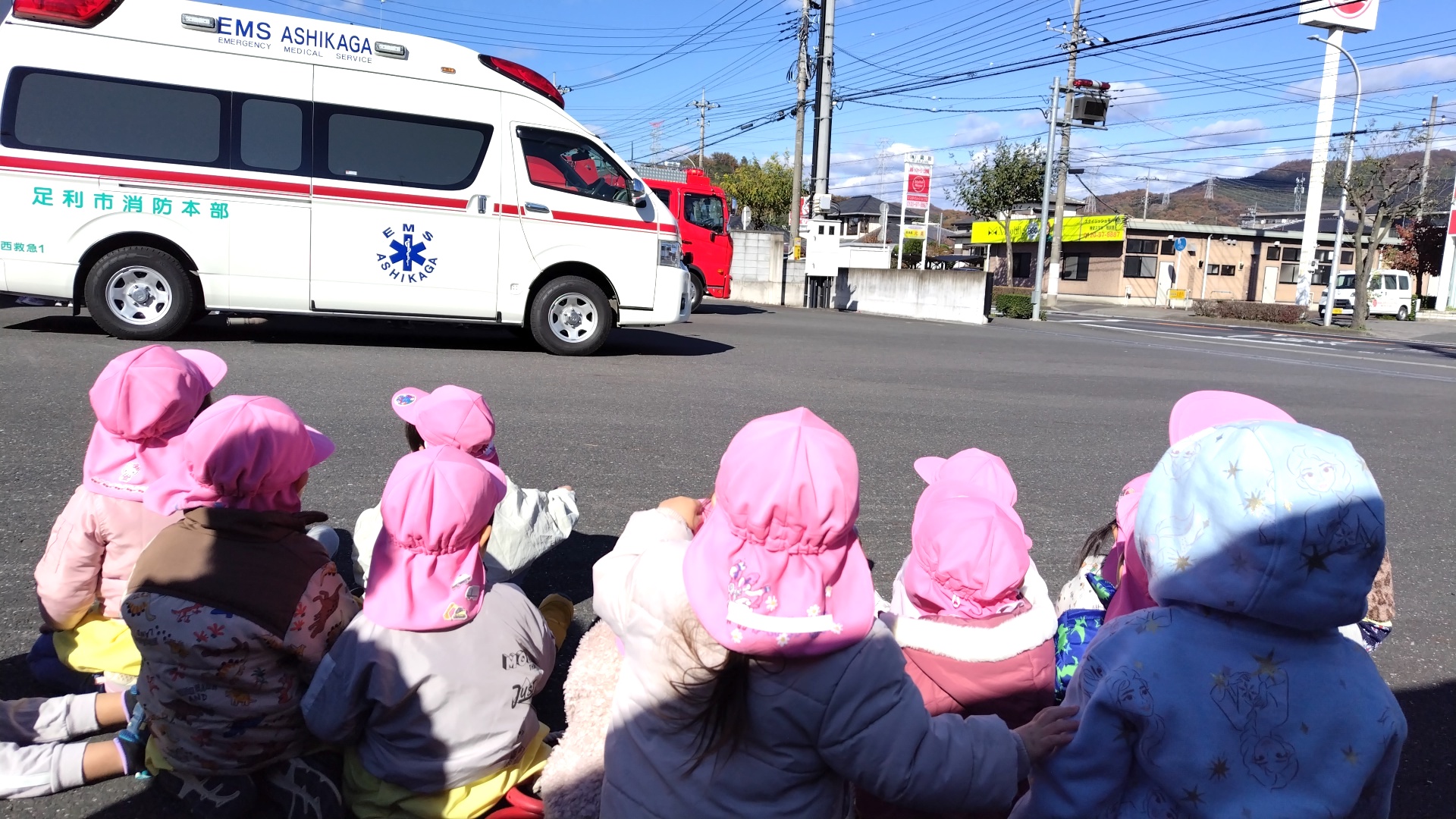 251119105951840LS お人形を出すと、すぐにお母さんになりきって赤ちゃんの見立てたお人形のお世話を楽しんでいました。お布団をかけて寝かしつけたり、ご飯を食べさせてあげたり、小さなお母さんたちが頼もしく見えました☆ 消防署見学に行ってきました。いつもより近くで消防車や救急車を見ることができ、働く車が大好きな子どもたちは本当にうれしそうでした。また、救急車にも乗ることでき、とても楽しい時間となりました♪