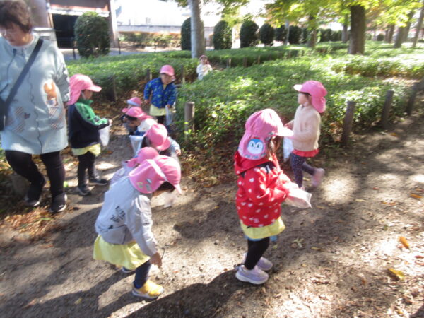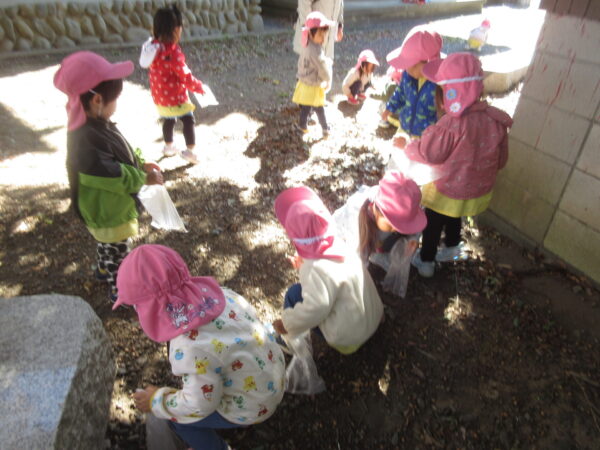 参拝後、神社裏へどんぐり拾いを楽しんできました。どこにたくさんどんぐりが落ちているかわかっている子どもたちは、夢中になってどんぐり拾っていました。林の方は迷路のようになっているので、先生が見守る中、元気に走りまわったり、どんぐりを見つけたりして楽しく過ごせました♪