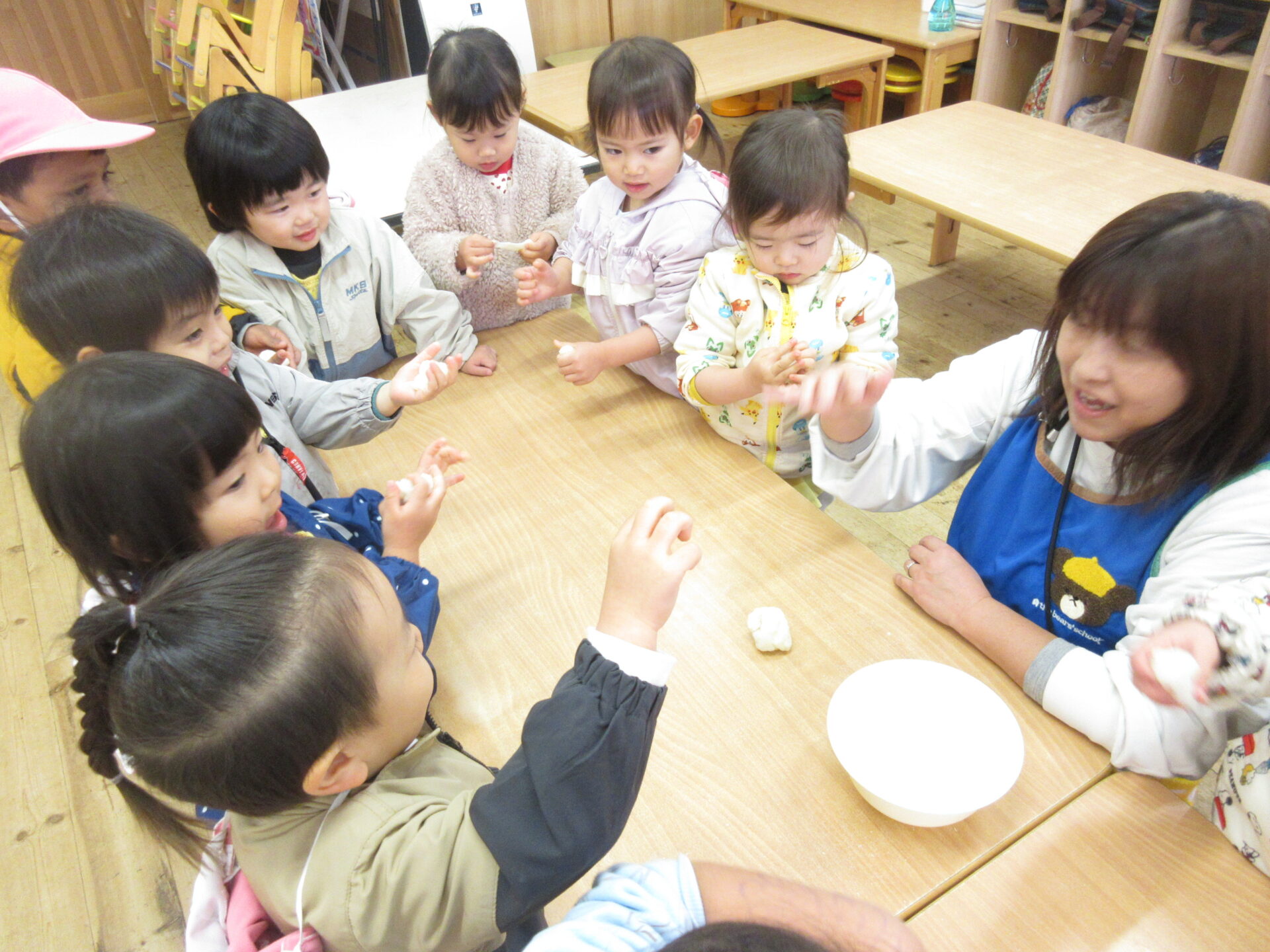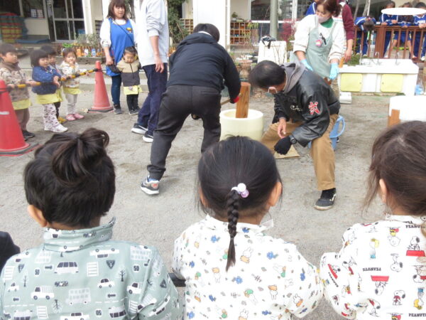 おもちつき大会に参加しました。炊き立ての餅米を食べてみると、ご飯とは違う食感に驚いていました。大人がお餅をつく迫力に見入っていたこども達は、子供用の杵を先生と一緒に持って、元気にお餅をつくことが出来ました♪ ついたお餅を少しもらって感触をみんなで確かめてみました。捏ねたり、伸ばしたり、指でツンツンして自分の頬と柔らかさを比べたりして楽しみました。