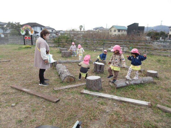 おもちつきの後は子育てガーデン広場でおともだちや先生と一緒に遊具や木の一本橋、自然物を使った遊びなど、体をたくさん動かして遊びました♪