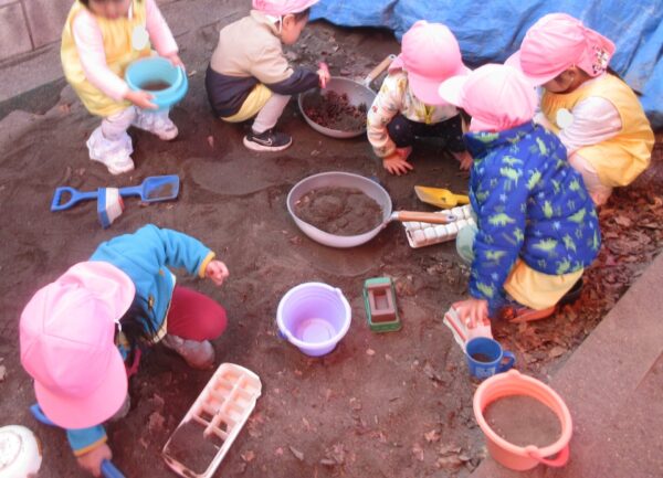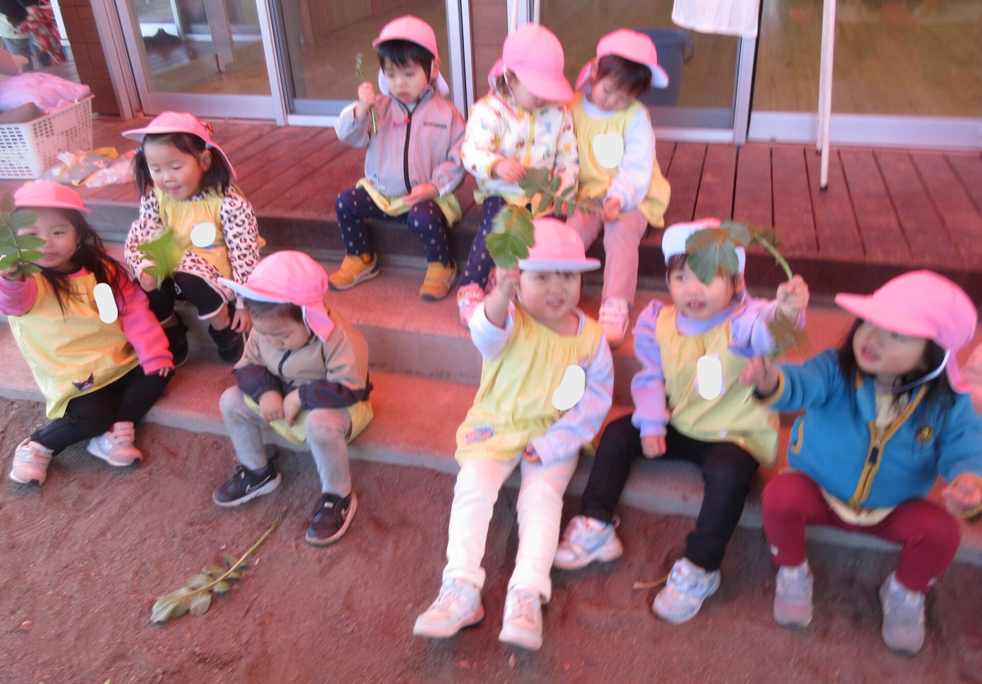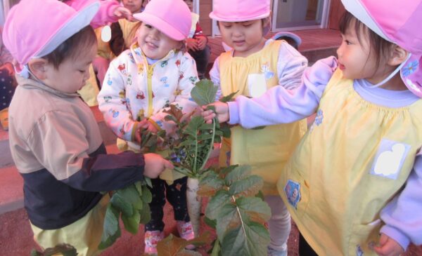 今日は以前プランターで育てていた大根が大きくなったので、みんなで大根の収穫をしました。子どもたち一人一人が大根の葉っぱを持って「うんとこしょ!どっこいしょ!」と大きな掛け声で抜くと、とてもかわいらしい大根が収穫できました。子どもたちは嬉しそうに大根を触ってみたり、匂いを嗅いでみたりとても興味津々な様子でしたよ。