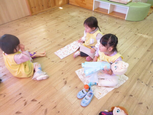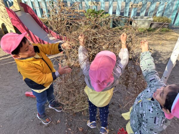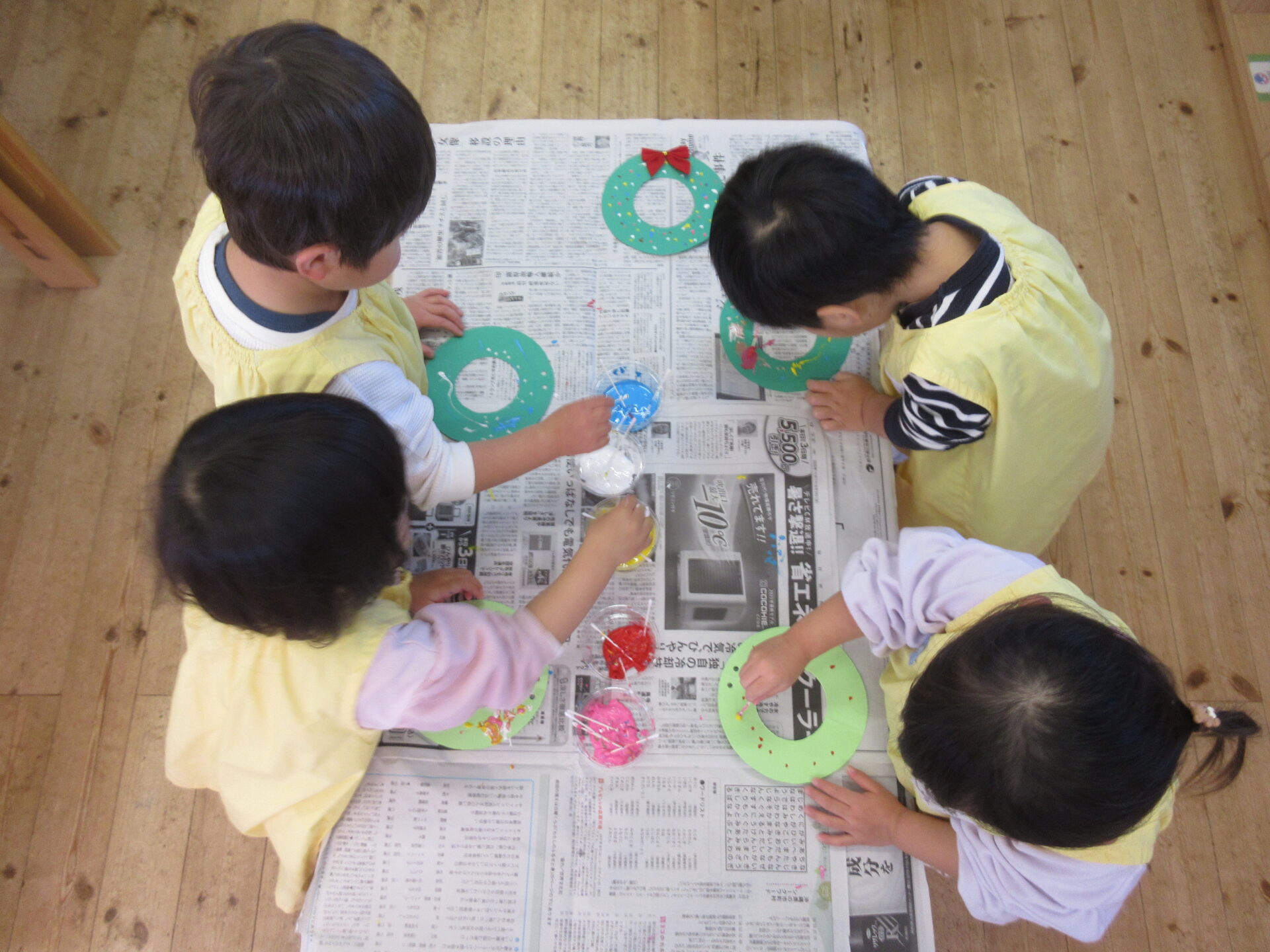 絵の具を使ってリースを作りました。好きな色に綿棒をつけてリースにスタンプのようにポンポン押してみたり、筆のように線を書いたり、色を混ぜ合わせたたりしながら楽しんで作っていました。クリスマスへの期待も膨らんだようです☆ センター庭では砂場やままごとハウスでお店屋さんごっこなど楽しみました。また、朝顔のタネがついているつるを持ち上げてみると、意外に軽かったようで驚いてました。