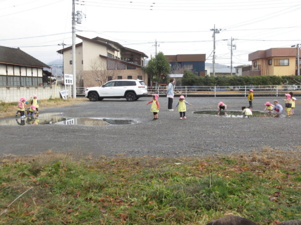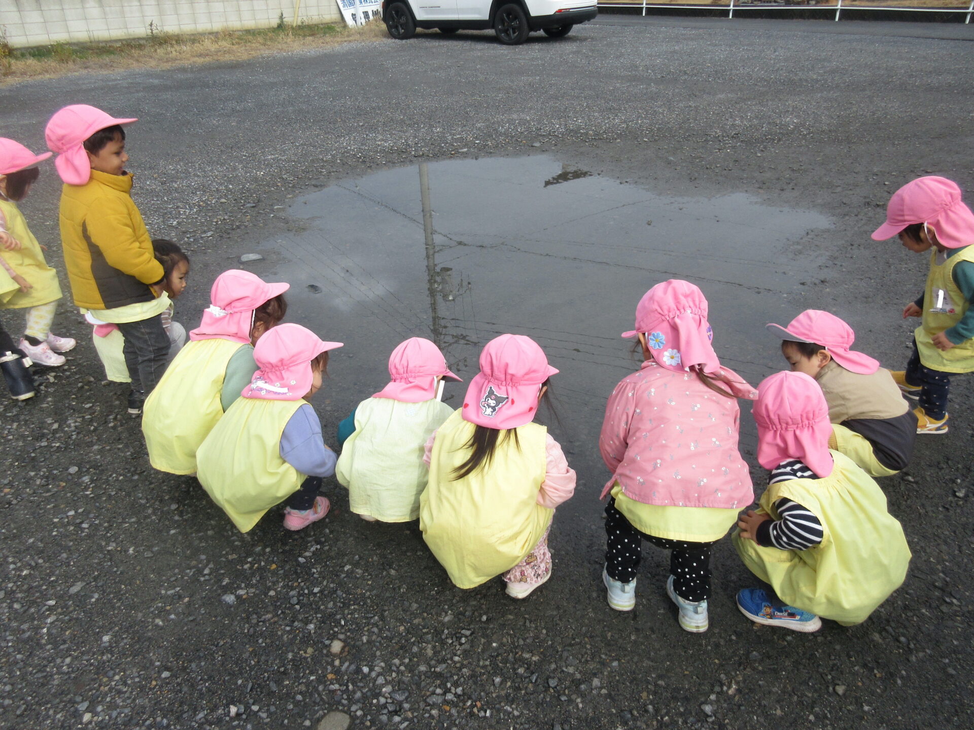 センター庭で遊んだ後、園周りへ散歩に行ってきました。電線に留まっていたカラスを発見すると、「カーカー」と鳴き真似をしてみたり、駐車場に停まっている車の色やバスの台数など、色や数に興味を示して会話が弾んでいました。 散歩途中の空き地で大きな水溜りを発見しました。子どもたちは水溜りを覗いて手を振るなど、鏡のようにして楽しんでいました。また、猫じゃらしを見つけてきて、水溜りの水につけたり、バシャバシャして楽しんでいる子もいました♪