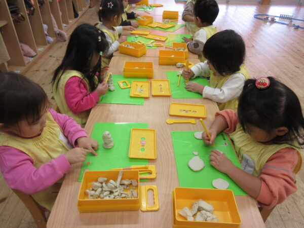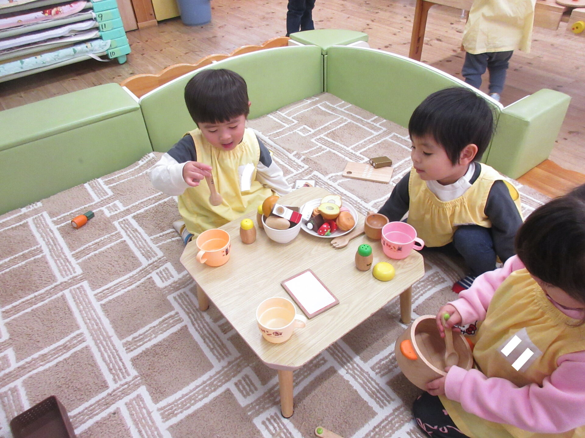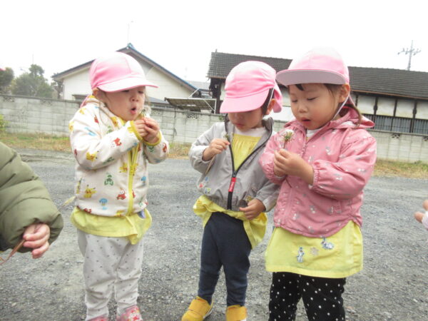 今日は園周りを少し散歩してから、室内でコーナー遊びを楽しみました。散歩では。空き地でタンポポの綿毛を見つけ、「せーの、ふー!」と息を吹きかけ綿毛を飛ばして楽しんだり、猫じゃらしを手に取ってお土産にしていました。 室内では、粘土やおままごと、プラレールで遊びました。粘土で好きなものを作ったり、ままごとではお友だちとのやりとりをしながら楽しむことが出来ました♪