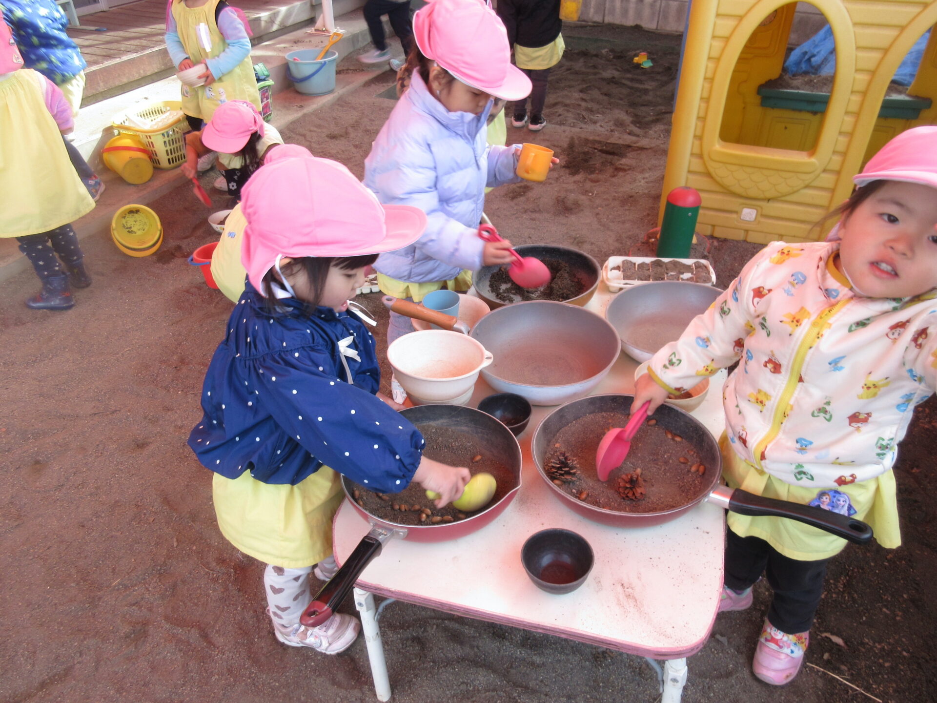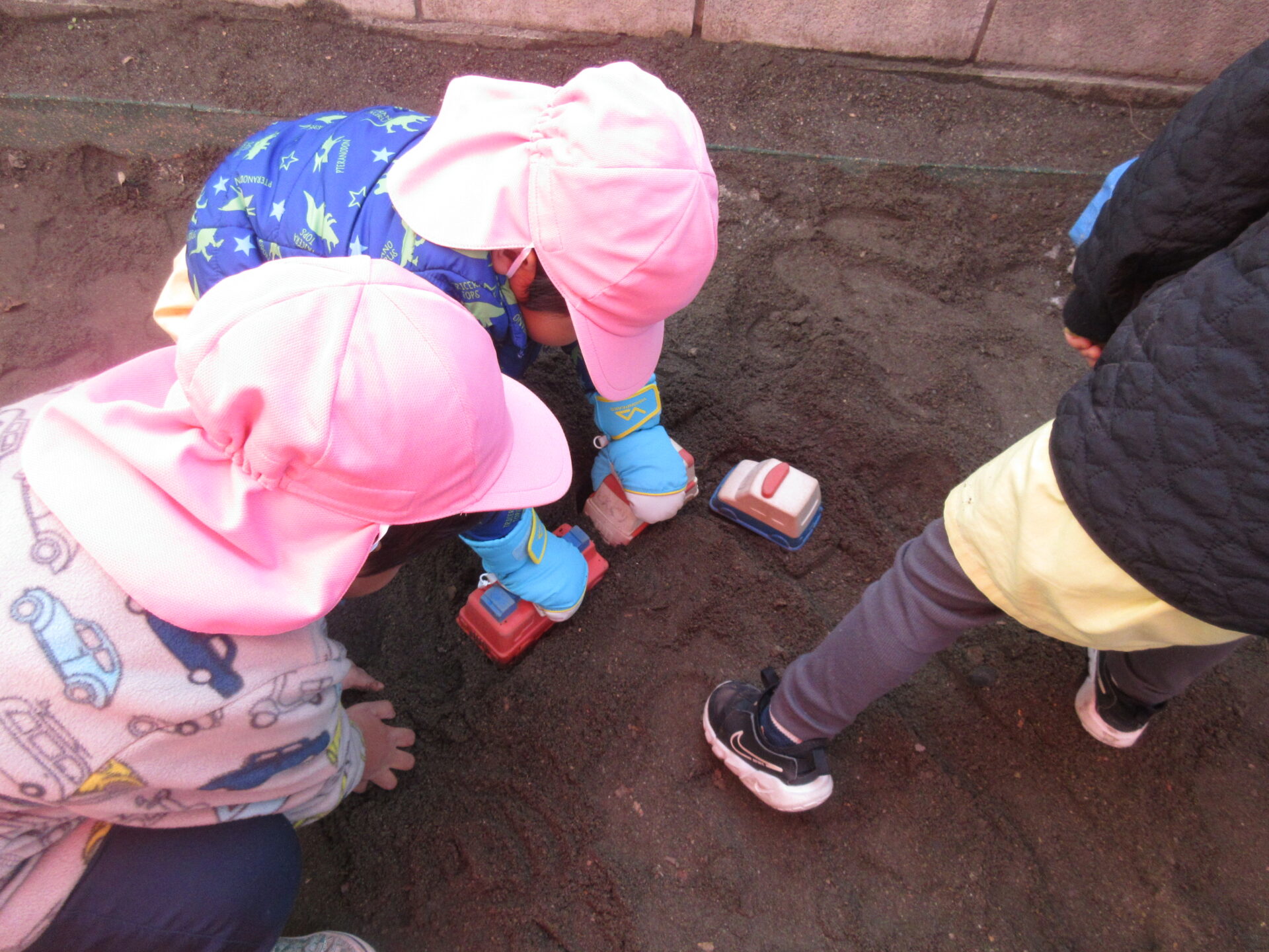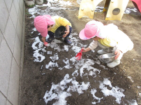 センター庭で遊びました。以前篠生神社で拾ってきたどんぐりや松ぼっくりを使ったままごと遊びや、車のおもちゃで土の上を手で動かして遊ぶ様子が見られました。また、昨日の雪がほとんど溶けてしまったのですが、滑り台周辺の壁側にまだ雪が残っていることを発見した子どもたちは、ボウルやバケツを持ってきて、シャベルや手で雪をすくって集めていました。昨日の雪より硬くなっていましたが、その雪を使ってままごと遊びにも取り入れて遊んでいました♪「また雪が降ってほしいなぁ」と願っているかわいいたまご組さんたちです☆