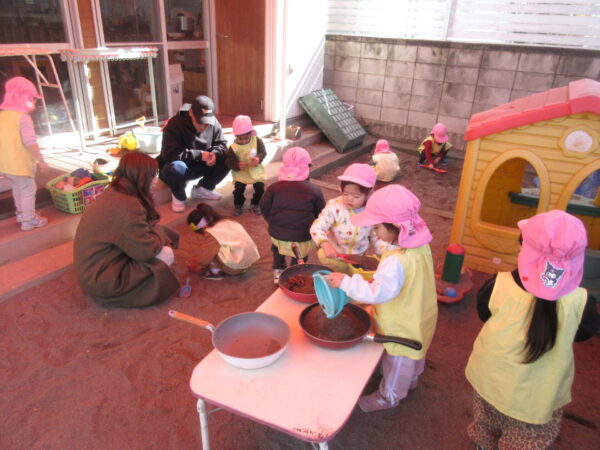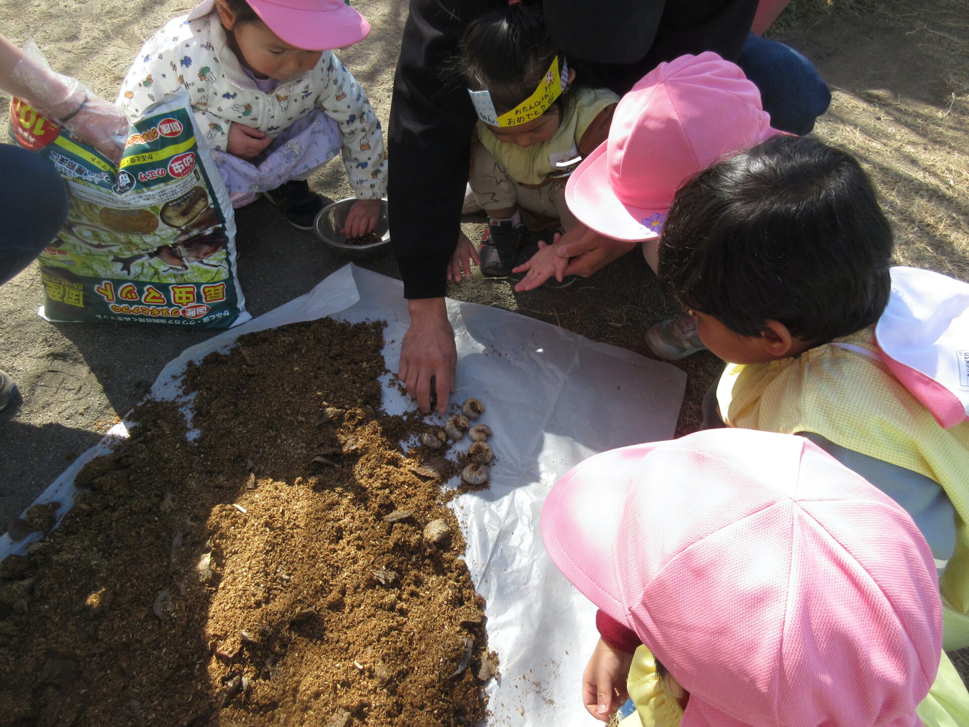 2月生まれのおともだちのお誕生会を行いました。ずっと楽しみにしていたお誕生会は、暖かな笑顔の中楽しく行うことができました。そして、たまご組の子どもたち全員が3歳になりました!みんなの成長がとても嬉しいです♪ センター庭で遊びました。砂場やままごと、滑り台など、好きな遊びをおともだちや先生、おうちの方も一緒に楽しみました。また、カブトムシの幼虫の土がえもしました。ゴロンと出てきた幼虫に興味津々の子どもたち。ツンツンと優しく触っていました。