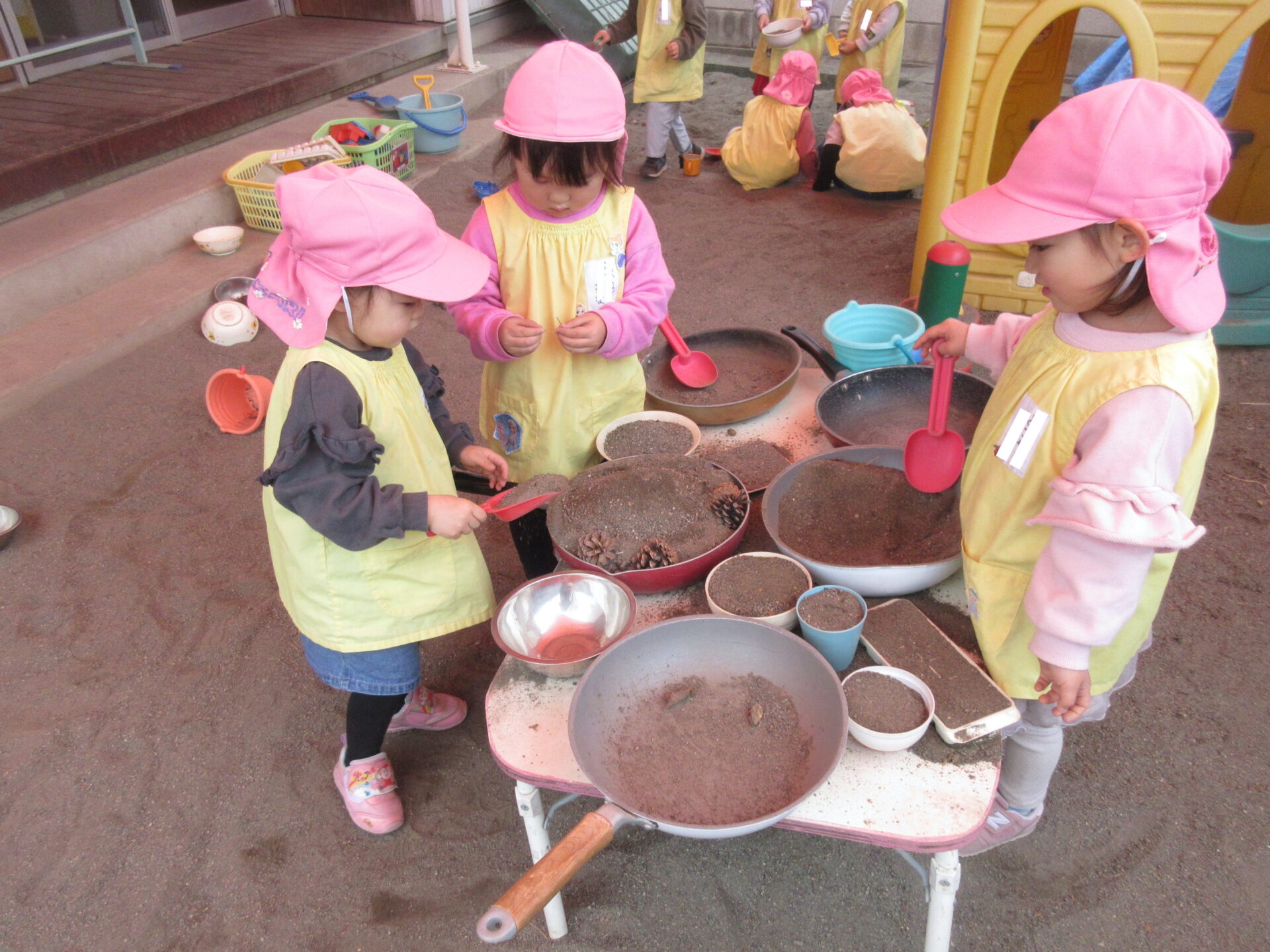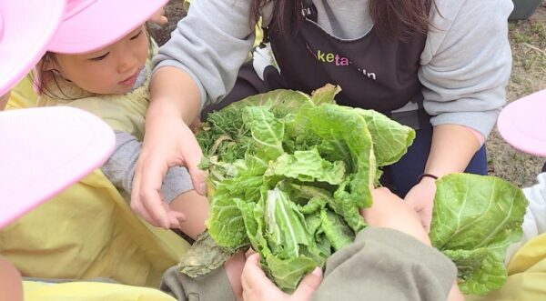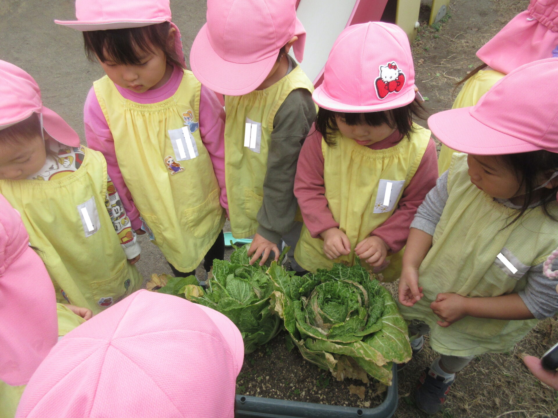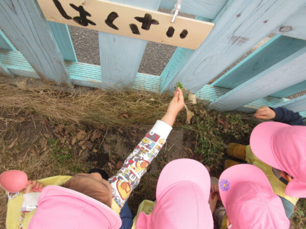 センター庭で遊びました。ままごとではシャフになりきっていて、どんぐりや松ぼっくり、白菜の葉っぱなどをフライパンに入れ、炒めたりに煮込むなど、お料理作りを楽しんでいました。また、てんとう虫を見つけて、みんなでてんとう虫に話しかけたり、動きの観察をじっくりしていました。 プランターで育てた「白菜」の収穫をしました。よく水やりをしてくれたり、白菜の成長を子どもたちは見守ってきたので、大きくなった白菜を自分たちの手で収穫できてとてもうれしそうでした☆