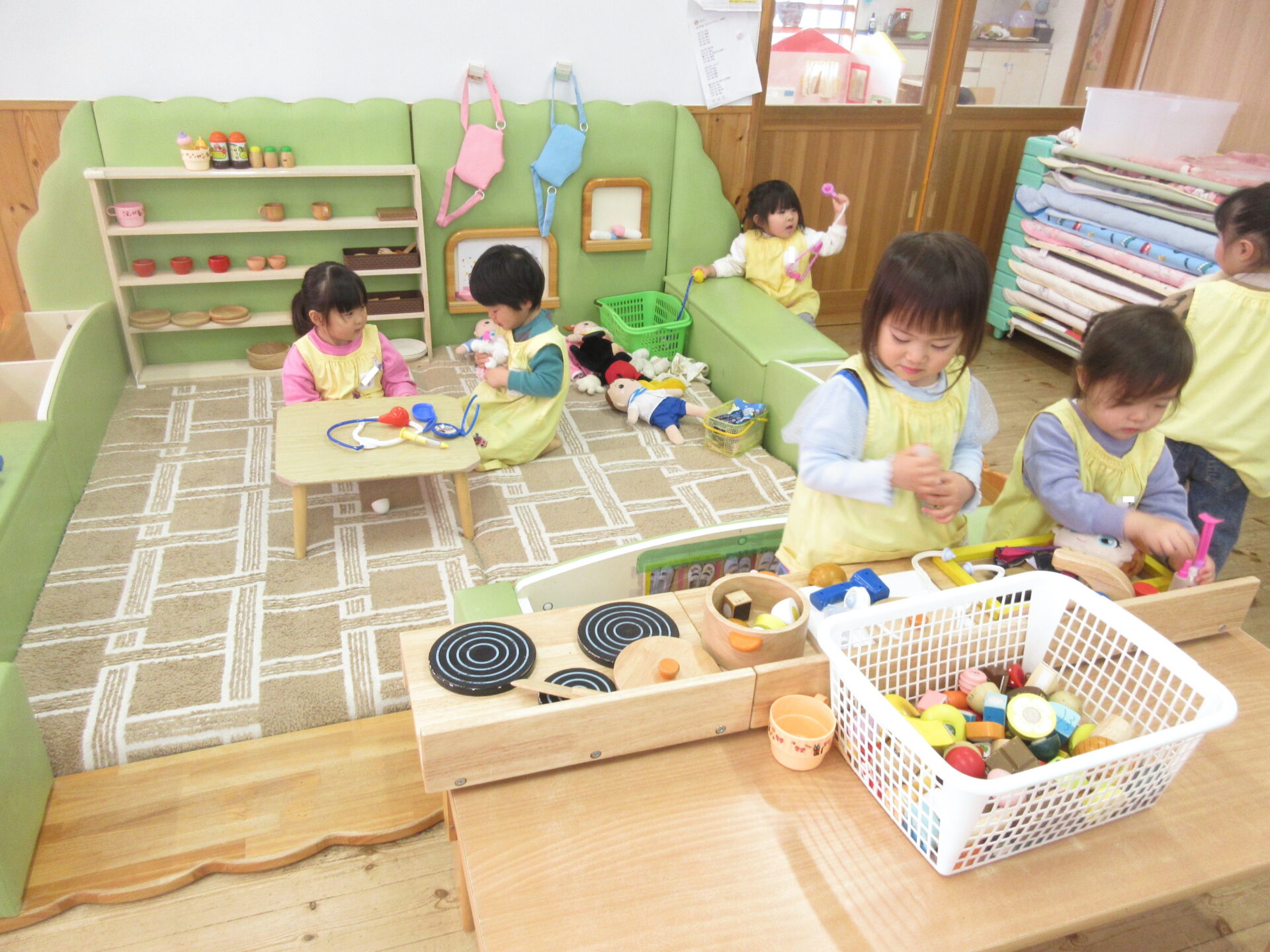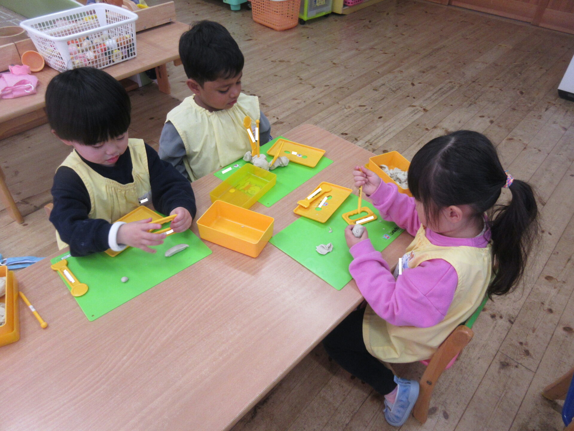今日は室内で遊びました。ままごとコーナーにお医者さんセットを用意すると、「今日はどこが痛いですか?」「風邪ですね、注射しましょう」など、お医者さんになりきっておともだちとのやりとりを楽しんでいました。また、粘土でも、「これはハンバーグだよ」「雪だるま作ってみよう」など、色々考えながら手先を上手に使って作っていました。