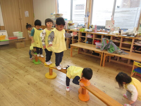 平均台では、忍者の様に這いつくばって渡ってみたり、お互い渡ってじゃんけんをしてみたり、平均台の遊び方も思い思い楽しむことが出来ていました。