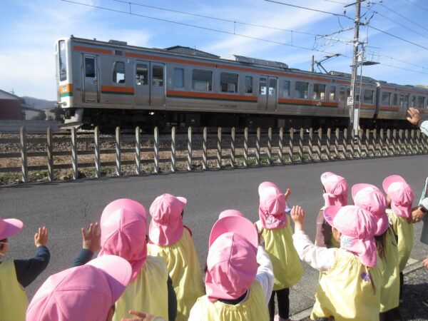 篠生神社へお散歩に行きました。道中になる遮断機を渡るとちょうど踏切が鳴り始め、右から来るのか、左から来るのか予想しながら電車の通過を見ることが出来ました。帰りも見ることができ、行きと違う模様と色の電車だったのでとても嬉しかったようです。