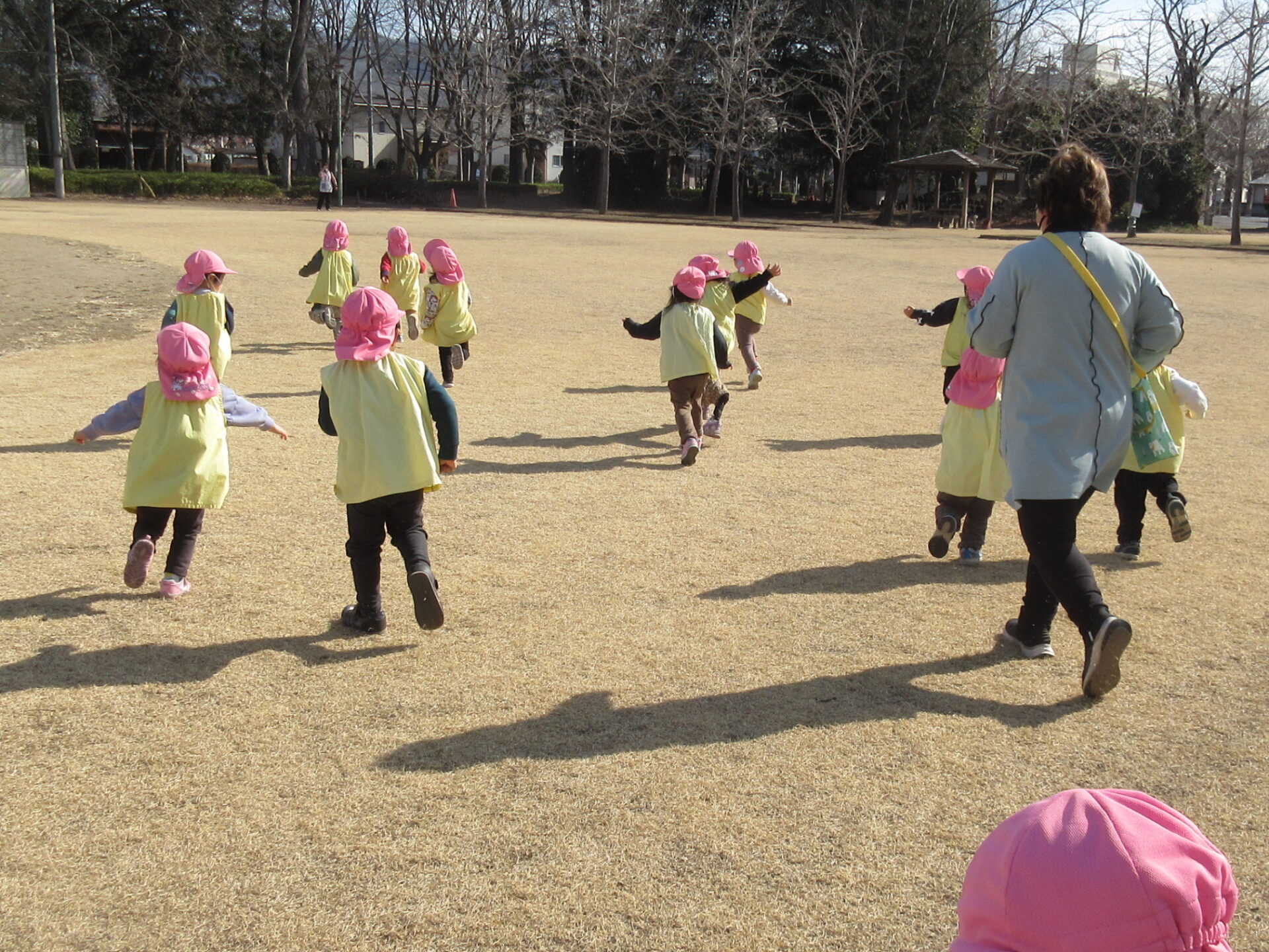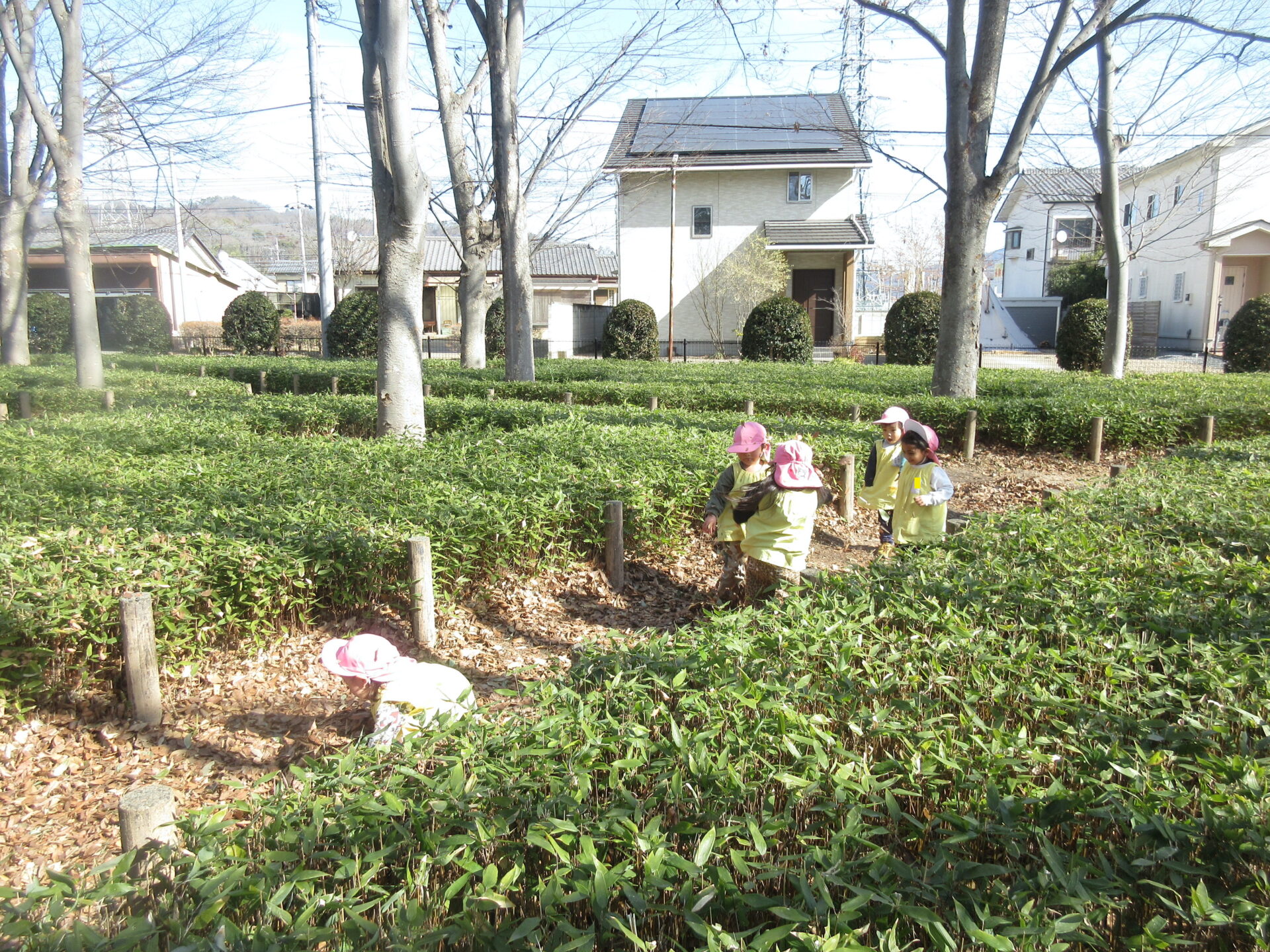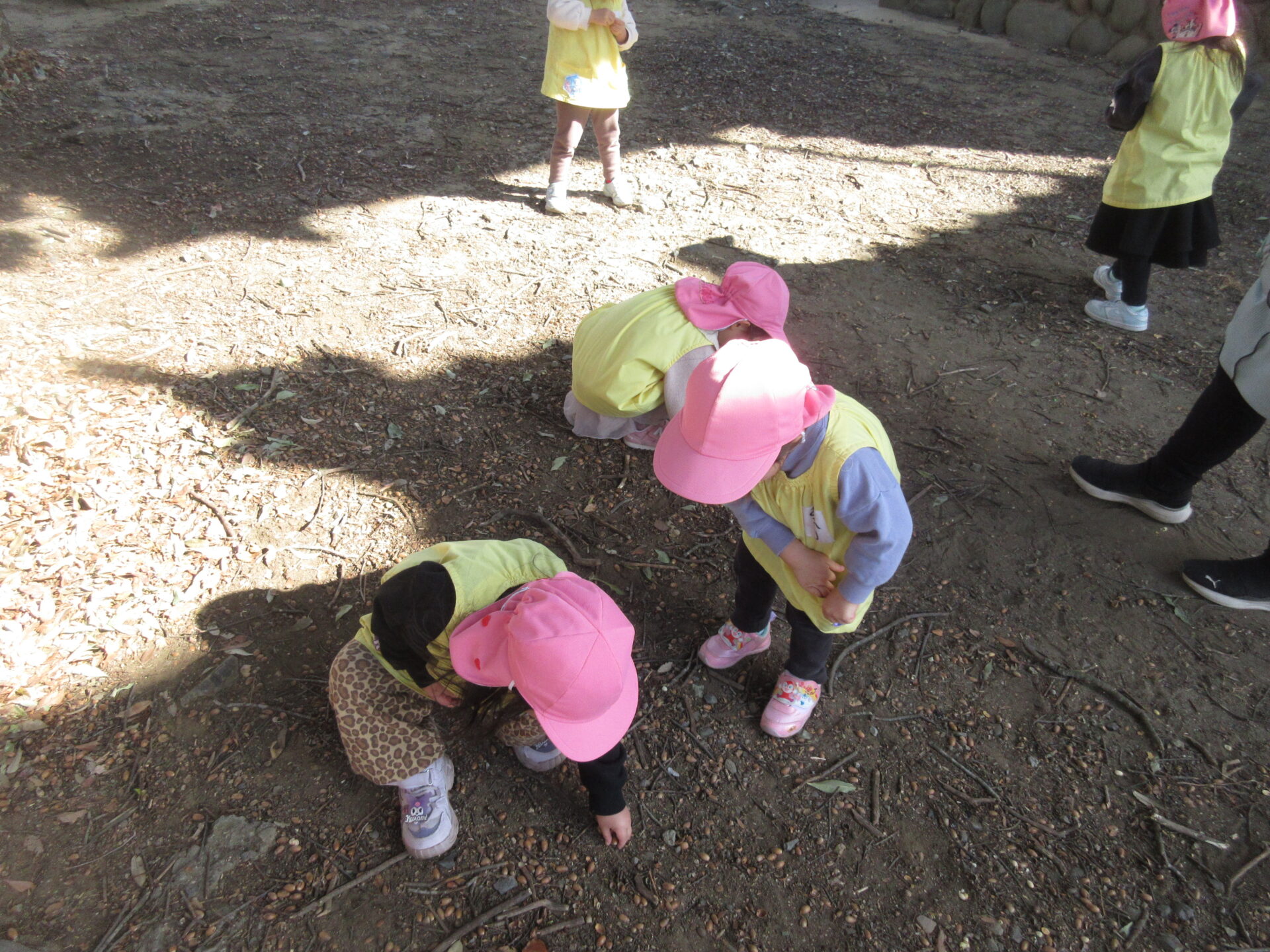 篠生神社裏の林の迷路でどんぐりを拾ったり、鬼ごっこをして遊びました。また、たくさんの落ち葉を抱えて「おにはーそと!ふくわーうち!」と豆まきならぬ、落ち葉まきを楽しんでいる子どもたち。葉っぱまみれになって大笑いしていました♪