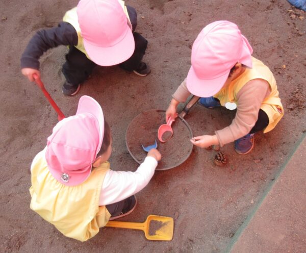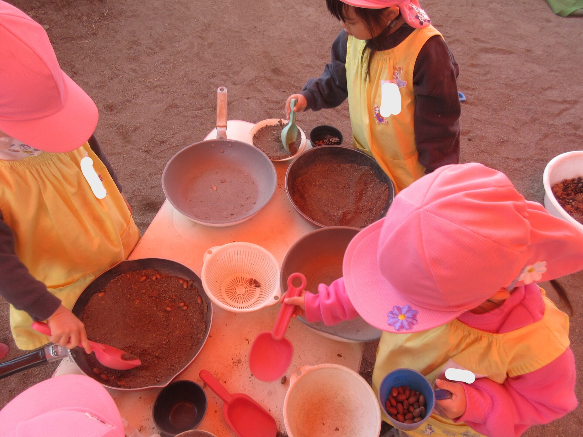 今日はセンター庭で遊びました。昨日篠生神社で拾ってきたたくさんのどんぐりを使って砂の中に入れて宝探しをていました。どんぐりを探し出すと「あった!」と嬉しそうな姿を見せてくれました。また、フライパンに入れて料理をしたりと楽しそうに遊んでいました。フライパンに入れる時の「カラカラ~」という音も楽しんでいましたよ。