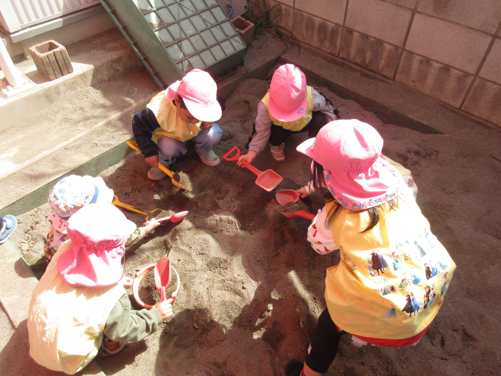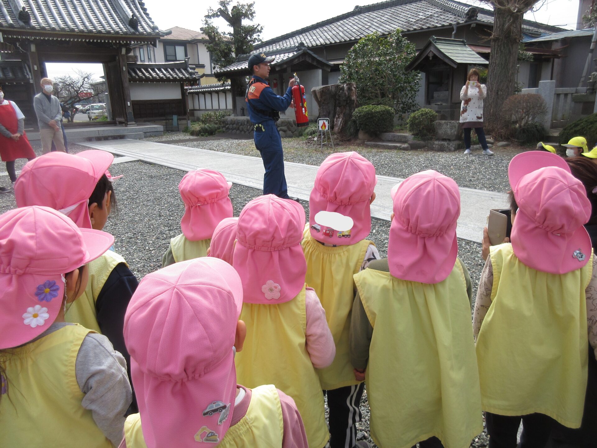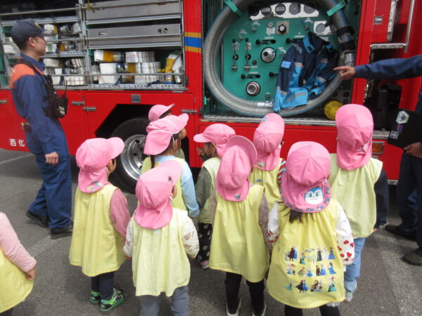 今日はセンター庭で遊びました。砂場ではお友達同士で山を作っていたり、木の実や石を埋めてみんなで楽しそうに遊んでいました。また、避難訓練を行い、消防士さんのお話を真剣に聞く姿がありました。近くで消防車を見せてもらうと子どもたちは「かっこいい~!」と、とてもうれしそうな様子でしたよ。