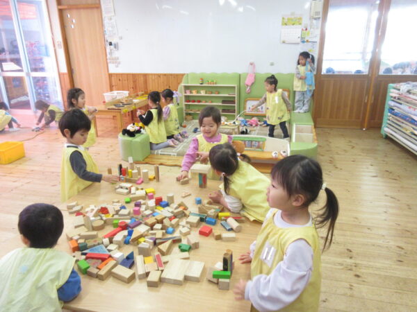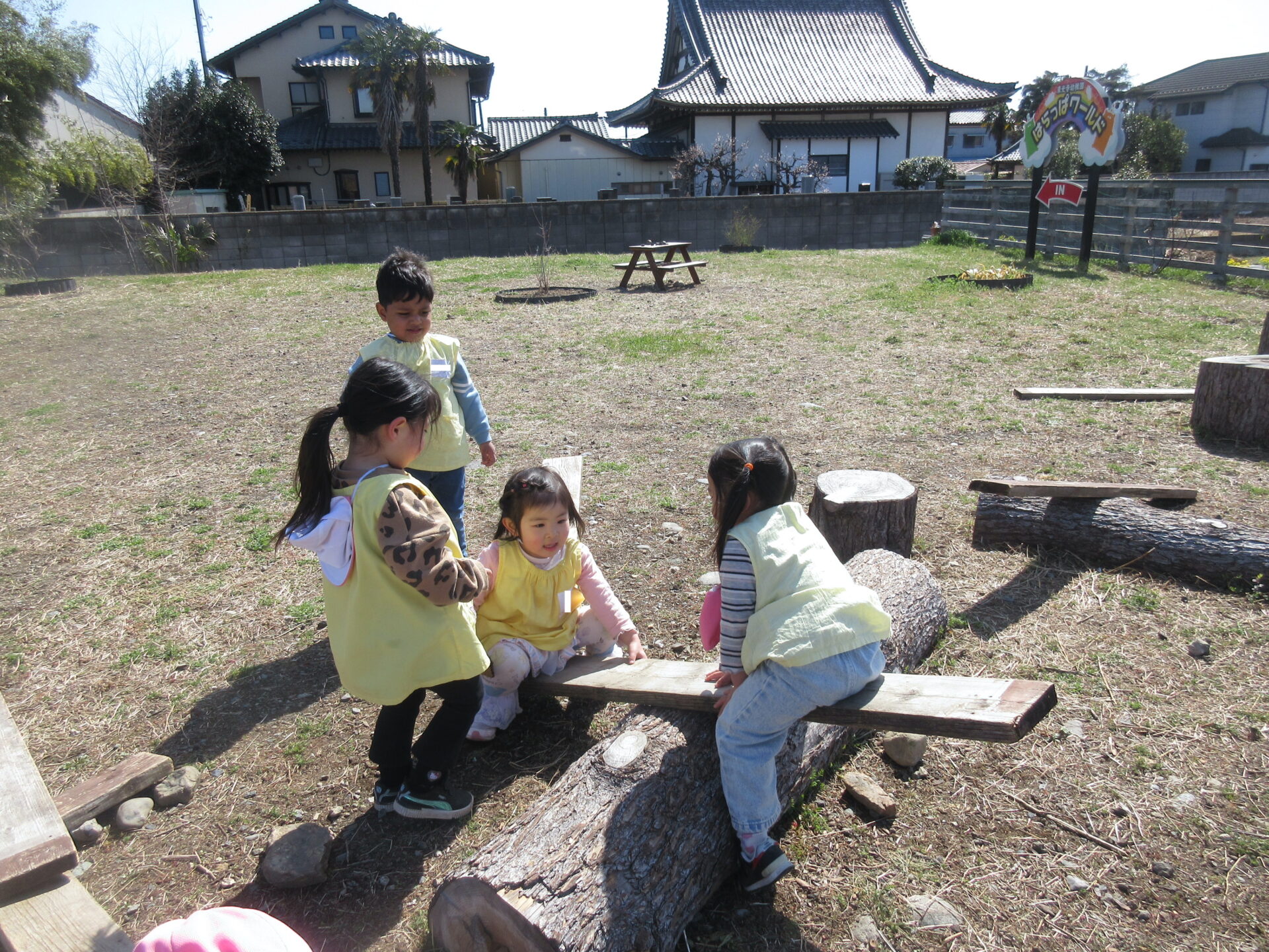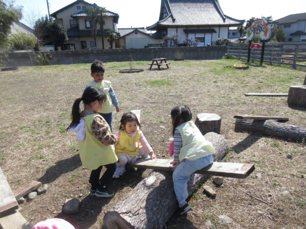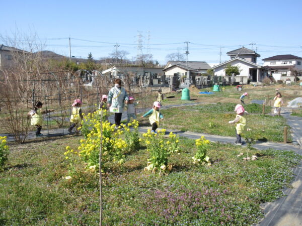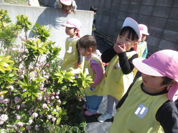 子育てガーデン広場で遊びました。おともだちと協力してシーソーを作って遊んだり、先生も混じってかくれんぼなど楽しみました。また、畑の方に降りてみました。こどもたちはどの花が「菜の花」かよく知っていて「これだよ!」と教えてくれました。また、沈丁花からはとても良い香りが漂っていて、「いい匂いだねぇ」とみんなで匂いを嗅いでみました。風が強かったですが、それにも負けないぐらい元気いっぱい遊んでいたこどもたちでした♪