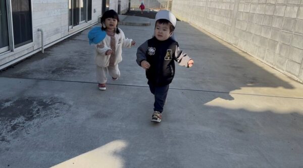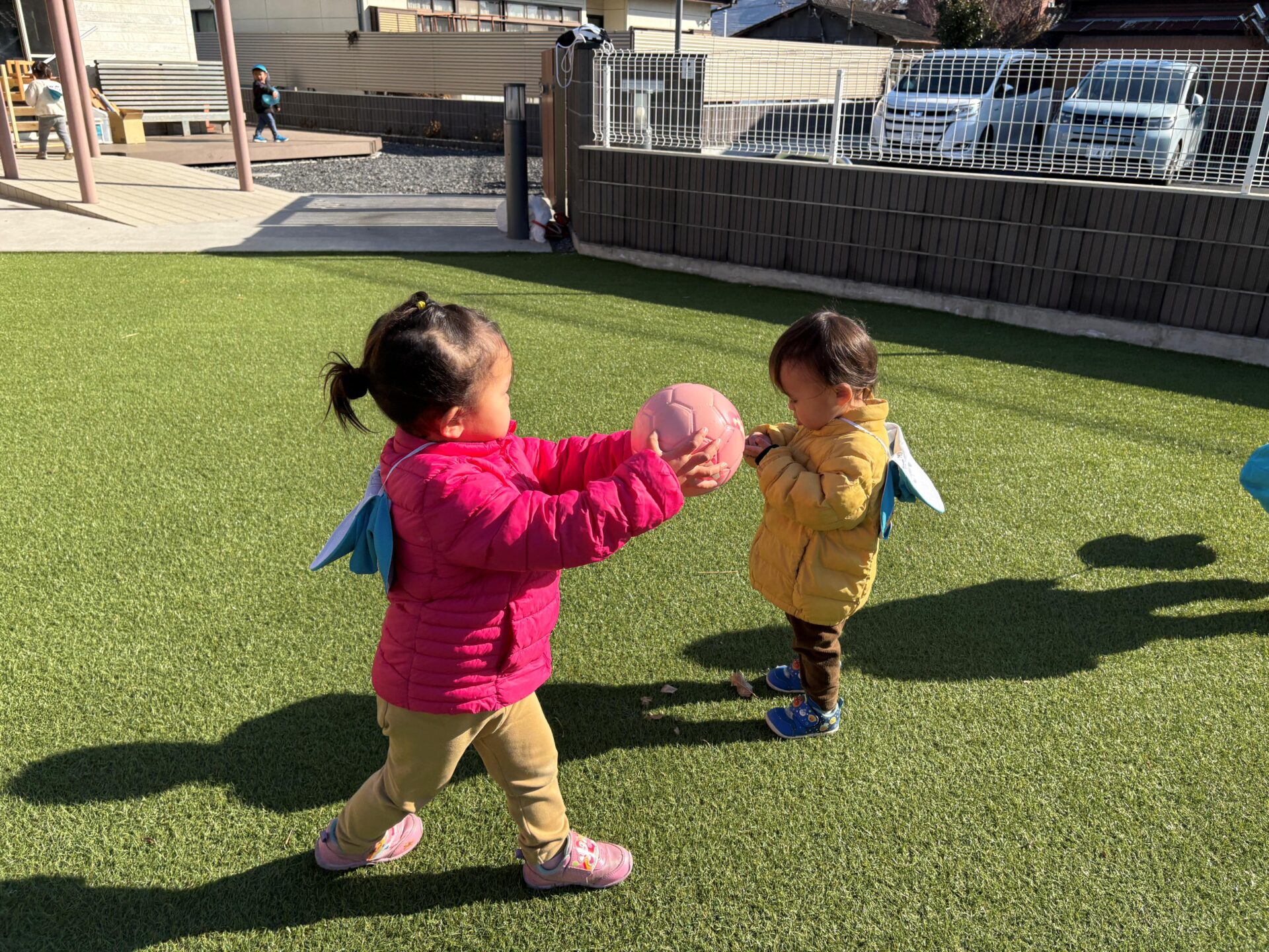 ぷーさんのお家で遊んできました。歩いている途中に、壁に自分の影があることに気づき、「ばいばーい」と手を振っていました。ぷーさんのお家のお庭では、みんなでかけっこをしたり、ボール遊びをしたり、伸び伸びと体を動かして過ごしました。