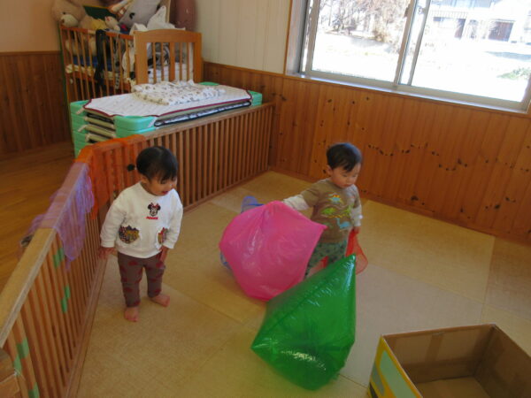 昨日のオーガンジーの布遊びに加えてカラーポリ袋も用意してみました。カラーポリ袋を膨らませてみると、興味を持って触ってみたり、持ち上げて運んでみたりしていました。保育者が上からぽーんと投げてみると、「わあ!」「おお!」と声を上げながら嬉しそうに反応していました。