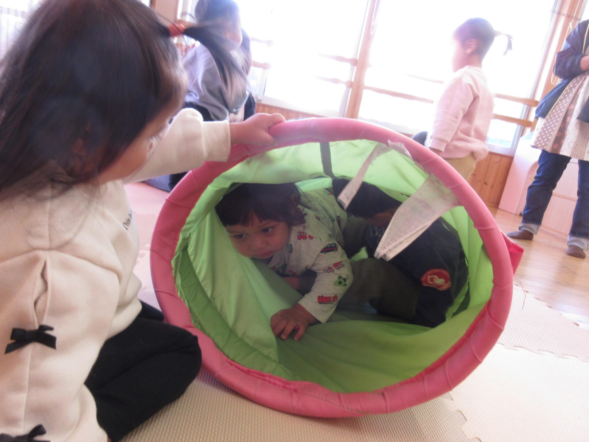 トンネルやマットで遊びました。お友だちが遊んでいる姿を見て、「入ってみよう」という気持ちになり、何度もくぐることを楽しんでいました。お友だちがくぐってくるのを覗き込んで「こっちだよ」と伝える姿も見られました。