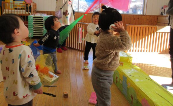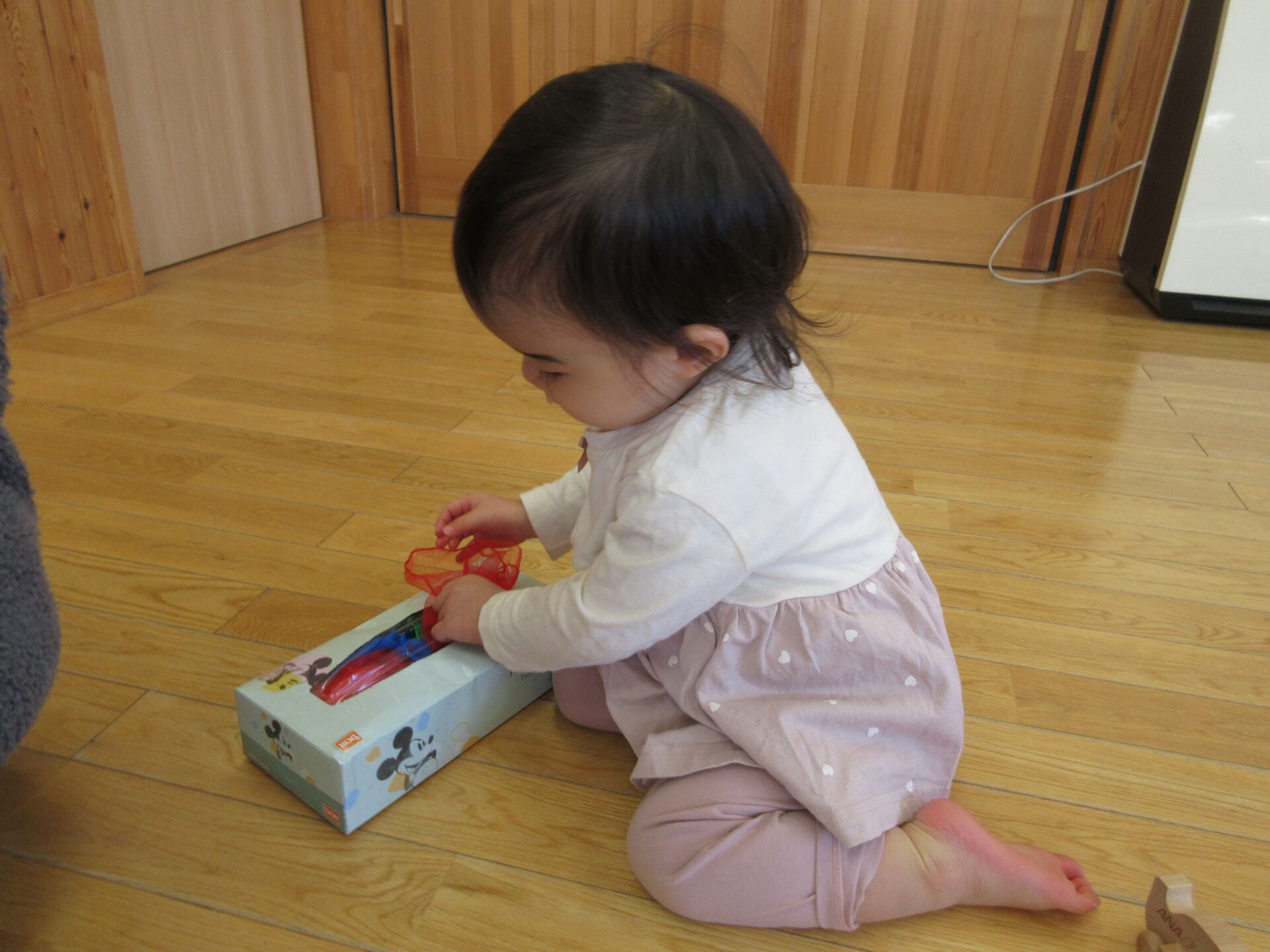 オーガンジーの布をティッシュの空き箱の中に入れてみると、何度も引き出す遊びを喜んでいました。シュッと引き出せる感触が面白いようです。引き出した布をまた空き箱の中につめる遊びも楽しかったようです。