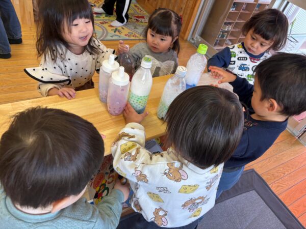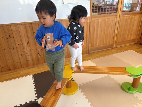 色々な色のジュースが入ったペットボトルを並べて、ジュース屋さんをしていました。「いらっしゃいませ!」と声をかけながら、定員さんになりきり、友だちとやり取りを楽しみながら遊んでいました。平均台では、バランスを取りながら渡って遊んでいました。腕を広げて一歩ずつ進み、最後まで渡ると嬉しそうな表情を見せていました。