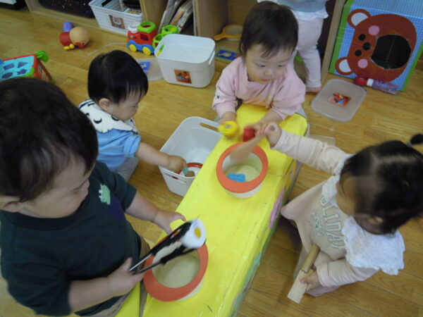 ままごとコーナーでは、台を囲うようにして遊ぶ姿がありました。様々な道具で遊ぶことが好きな子どもたちは、混ぜる、食べる真似をするなどの仕草がとても上手な様子があります。