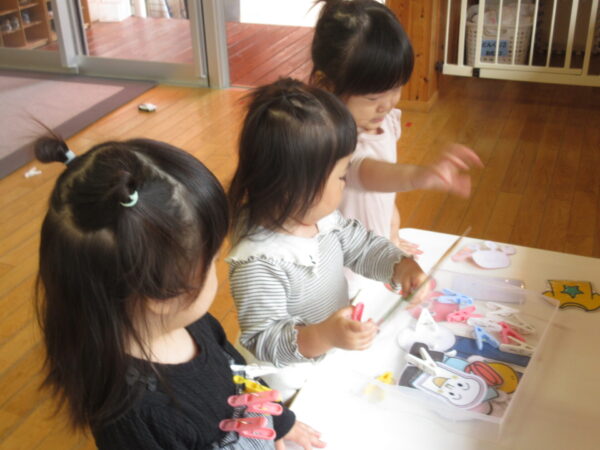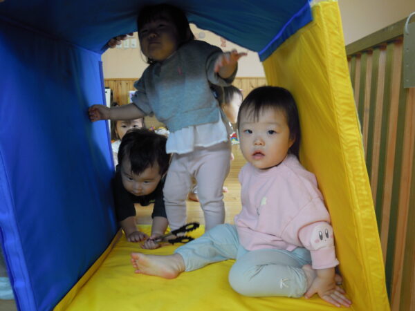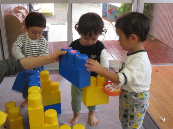 室内でおままごとやブロック、洗濯ばさみを使った遊びをしながら過ごしました。おままごとに洗濯ばさみを取り入れて遊ぶ姿や、ブロックをお友だちと積んで喜ぶ姿、お人形さんをベッドに寝かせて「ねんね」とトントンをする姿が見られました!