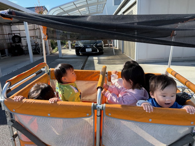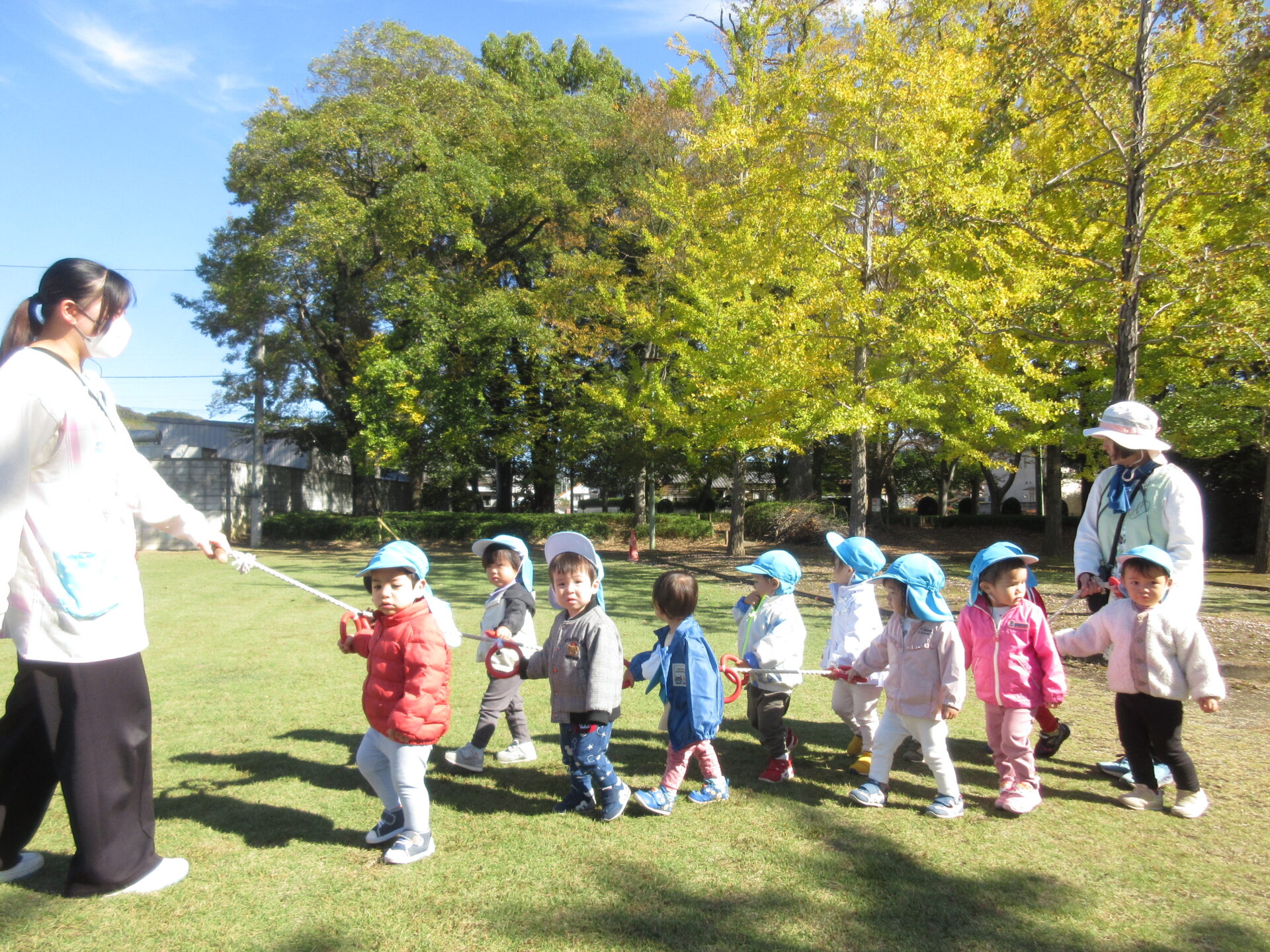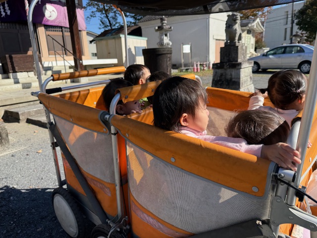 *1組 篠生神社へ参拝に行ってきました。保育者が実際に参拝をしてみると、真剣に見ている姿がありました。途中で電車が通るのを近くで見ることができ、嬉しそうに手を振っていましたよ。 *2組 初めて、篠生神社参拝に行きました。行き帰りで電車に会うこともでき、大喜びな子どもたちでした! また、どんぐりや紅葉なども発見して嬉しそうにする姿や、「これからも元気に過ごせますように」と先生と一緒になって手を合わせる姿も見られました。